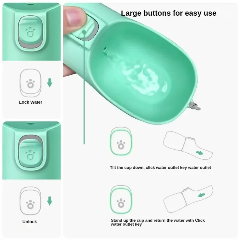 4.Fácil de usar: operación con una sola mano.Apertura/bloqueo con una sola tecla.1.Al desbloquear y presionar la tecla de agua, se libera agua en el recipiente para que su mascota beba fácilmente.2.Presione la tecla de agua para escurrir el agua no utilizada en la botella y no desperdiciará agua.3.Bloquee la tecla de agua para evitar presionar accidentalmente la tecla de agua.