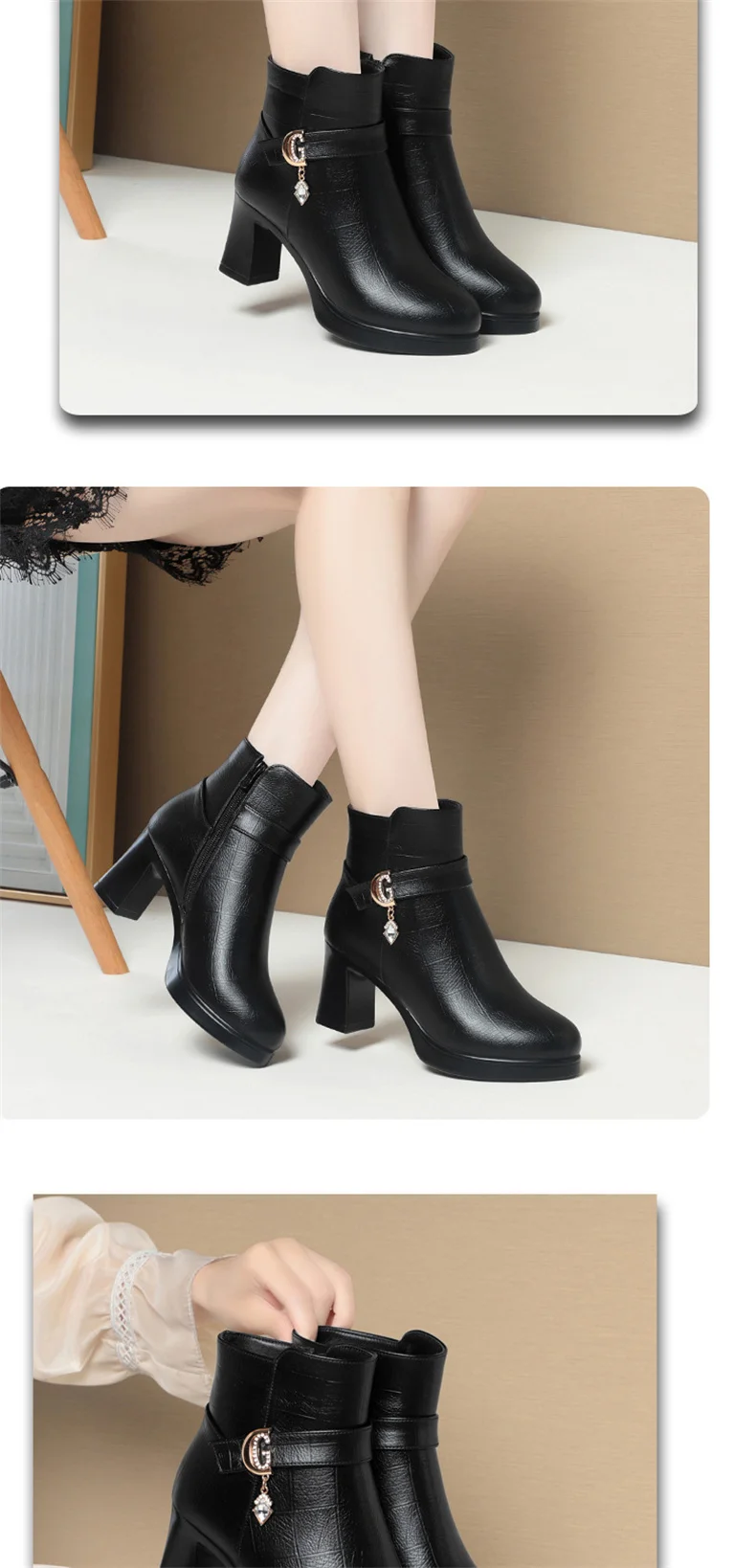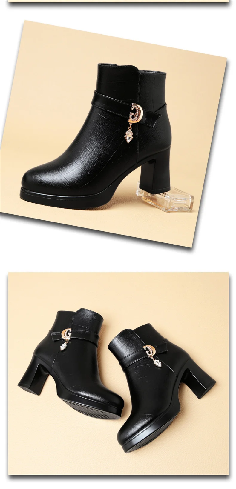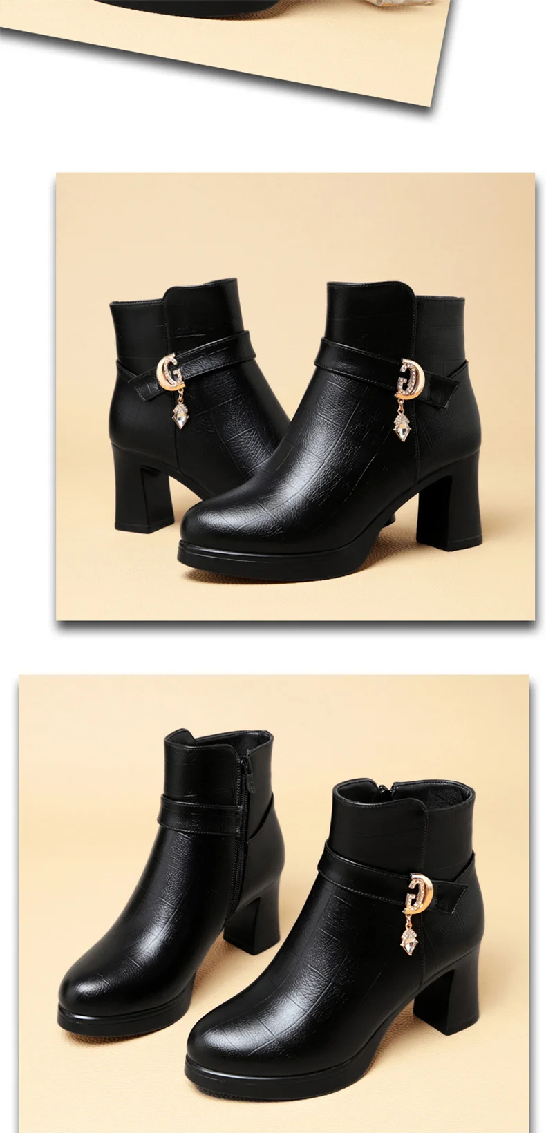 Botines de cuero suave para mujer, botas de nieve cálidas de felpa gruesa, botas antideslizantes para madre, zapato de suela gruesa de tacón alto, moda de invierno
