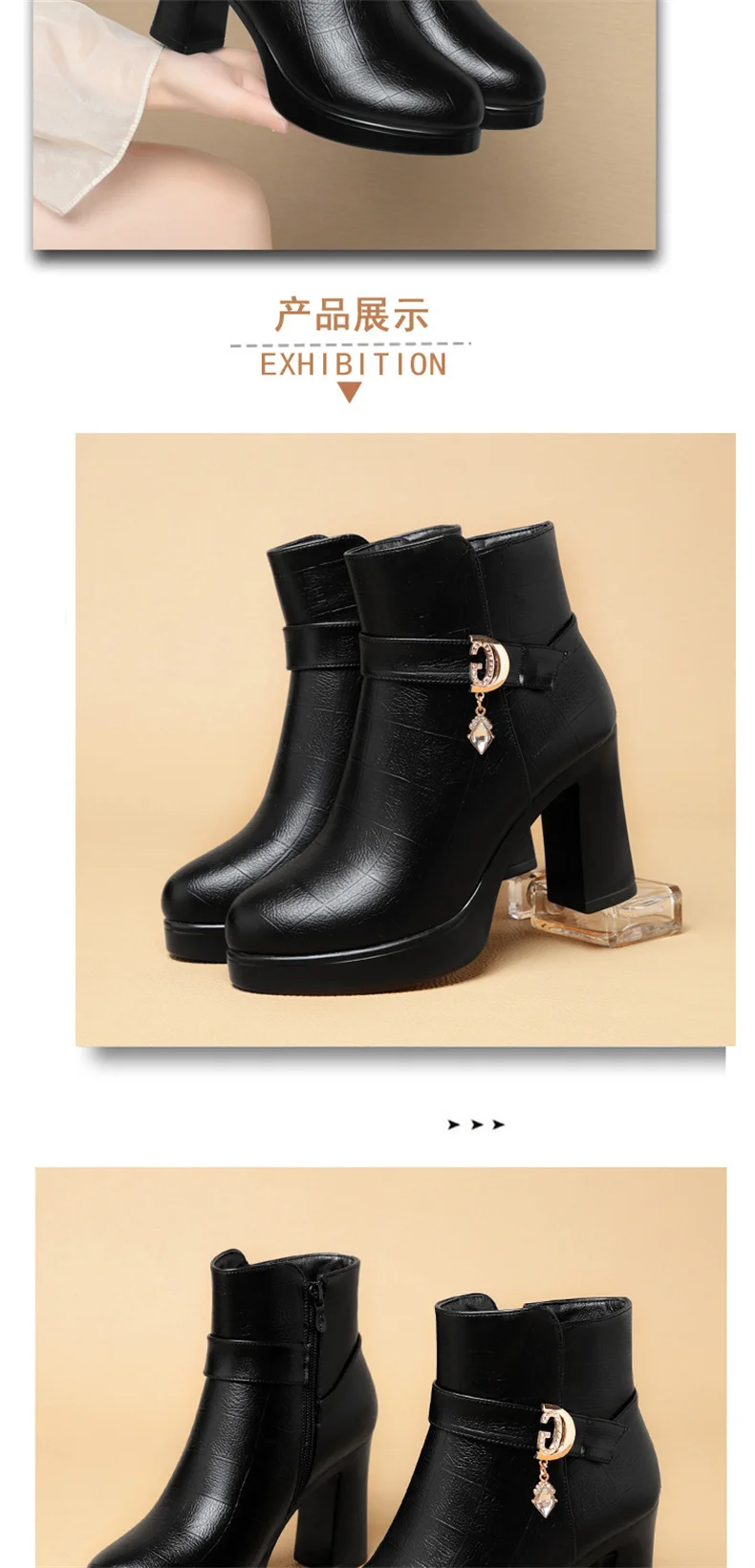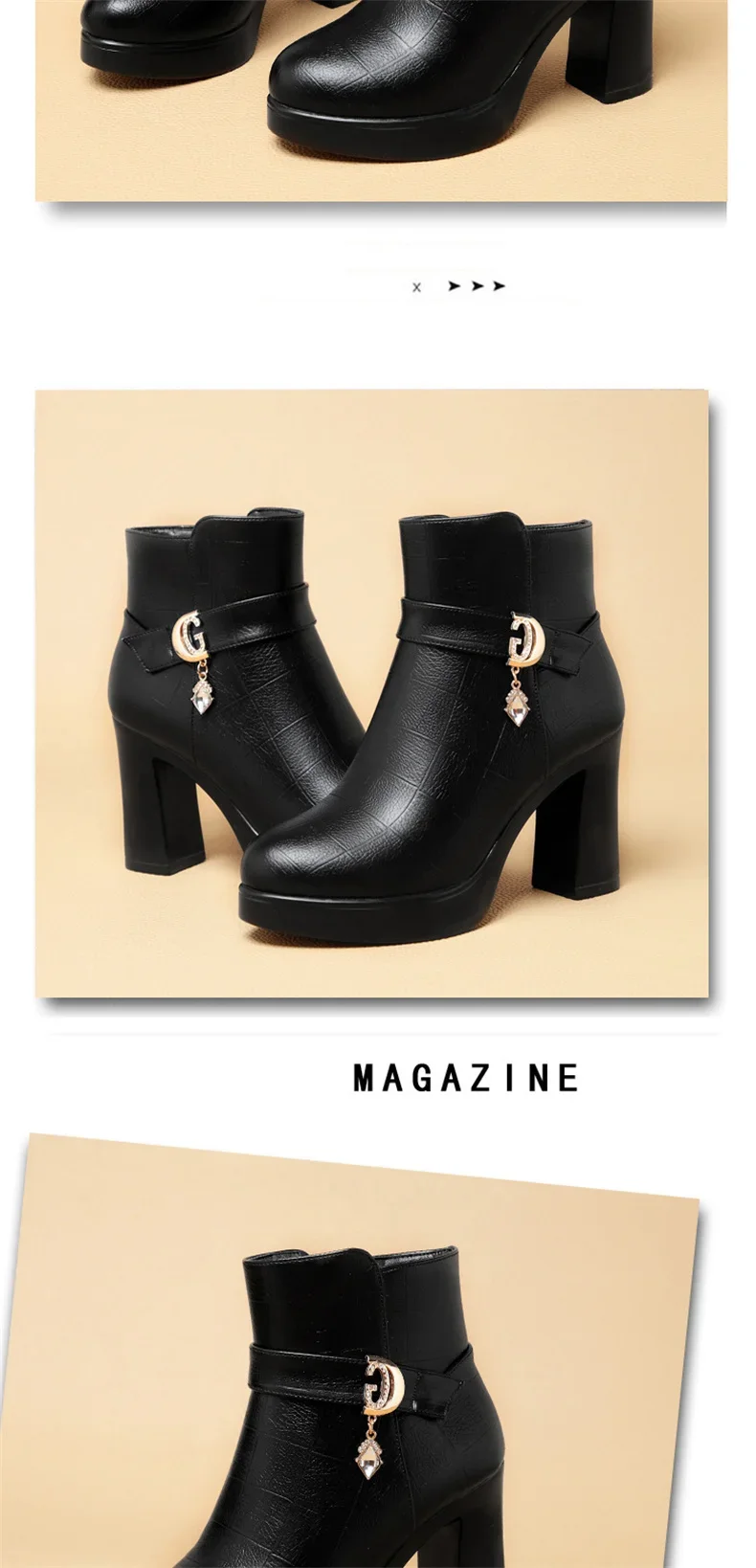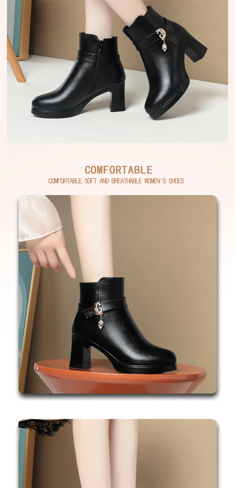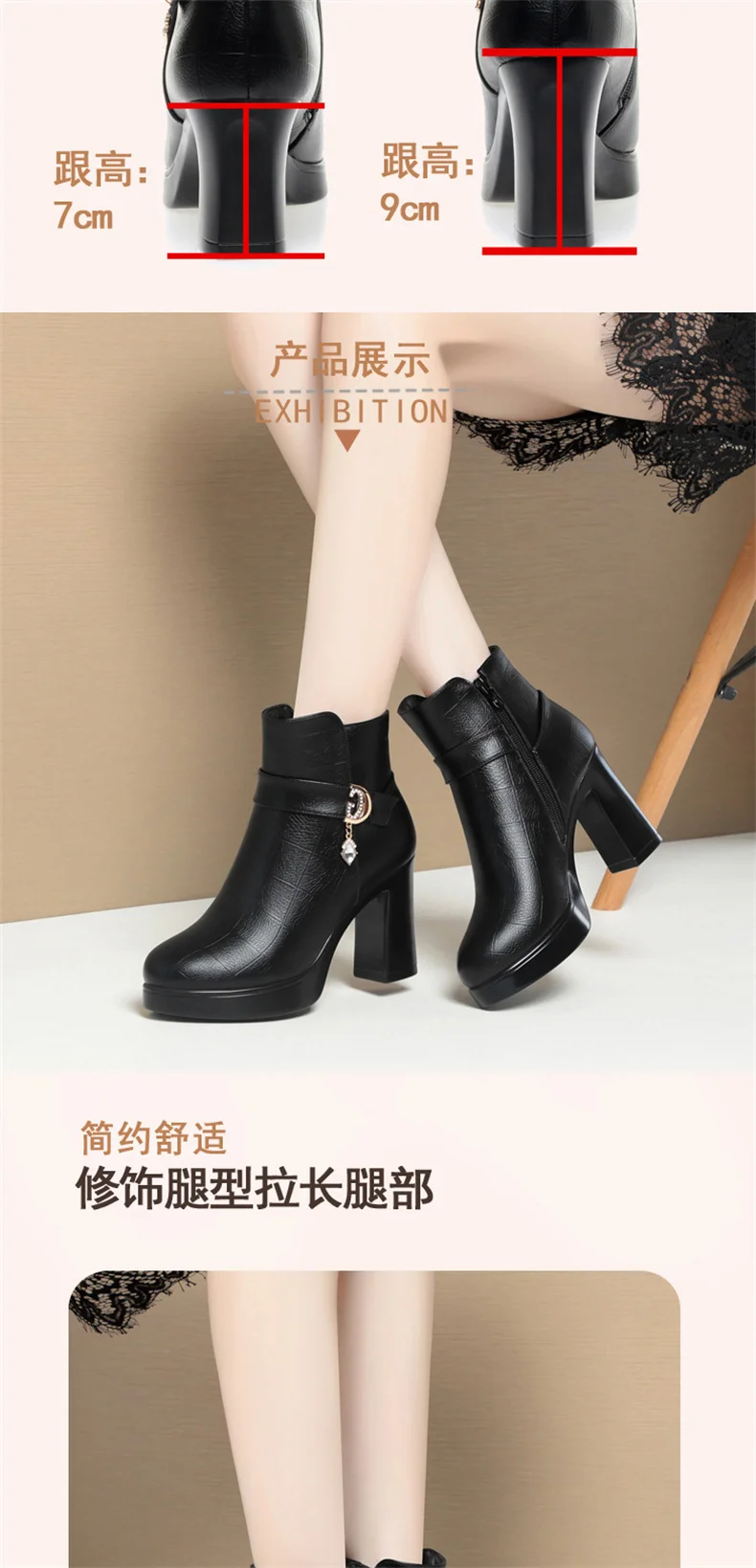 Botines de cuero suave para mujer, botas de nieve cálidas de felpa gruesa, botas antideslizantes para madre, zapato de suela gruesa de tacón alto, moda de invierno