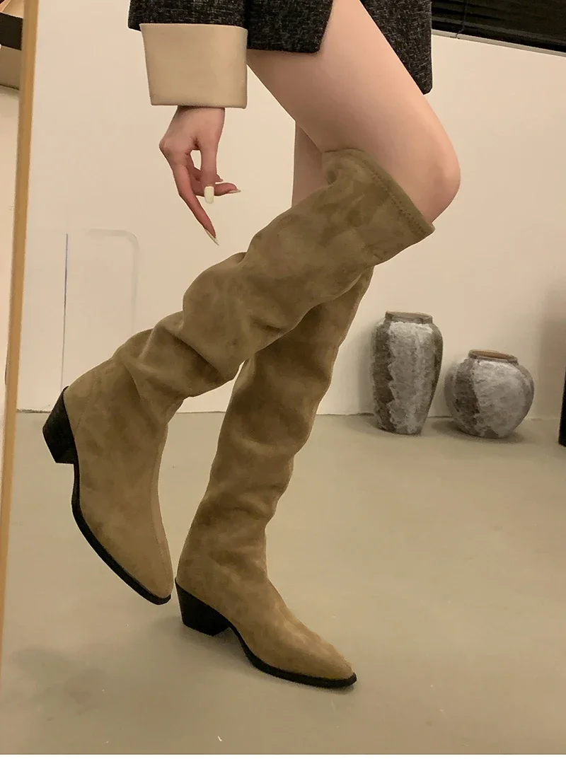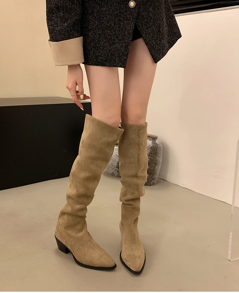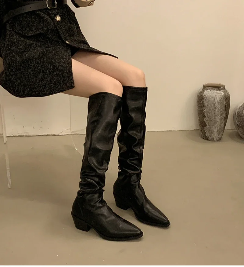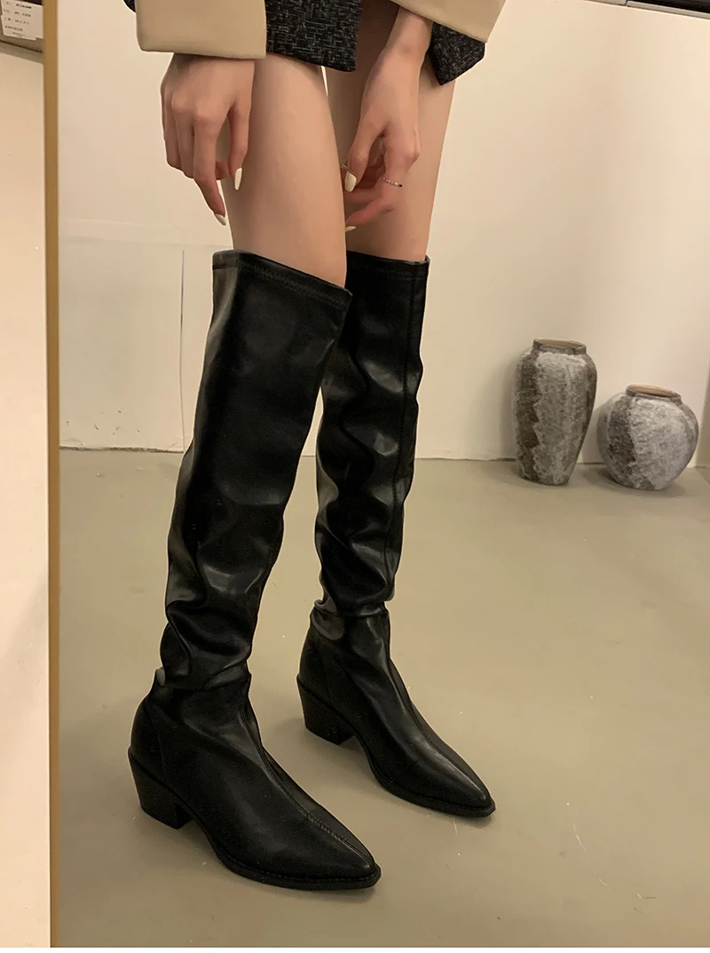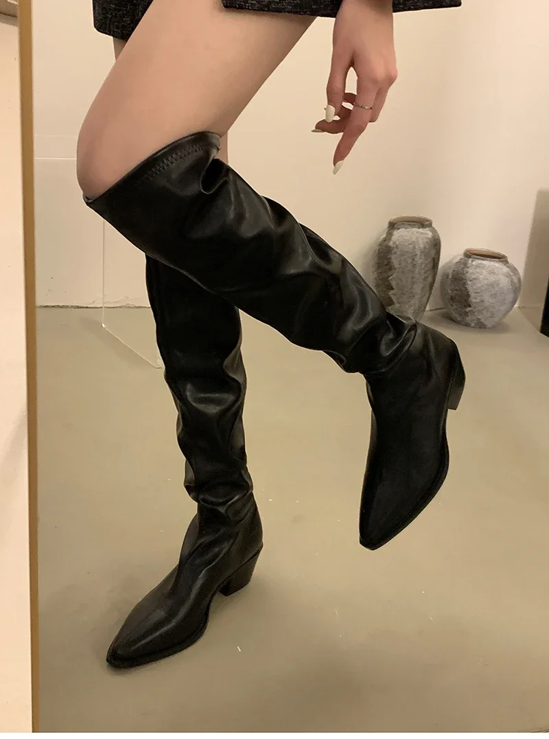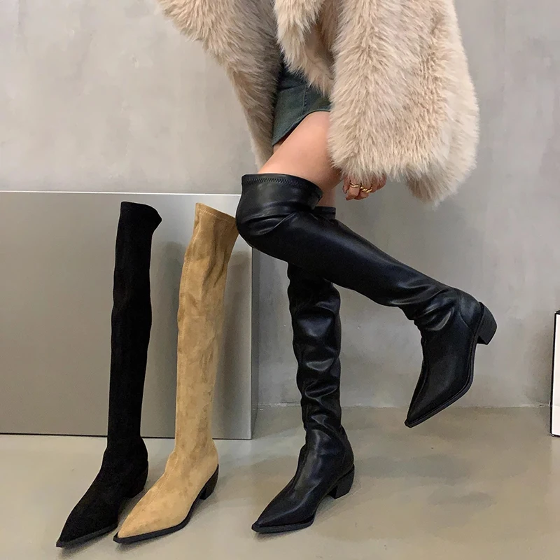 Botines largos Vintage con punta estrecha para mujer, botines por encima de la rodilla, Otoño Invierno, tacón grueso, caballero