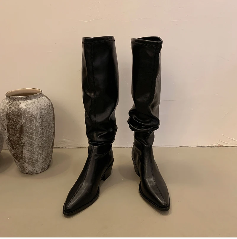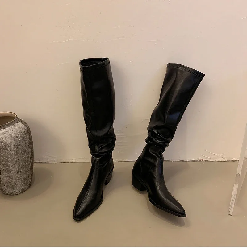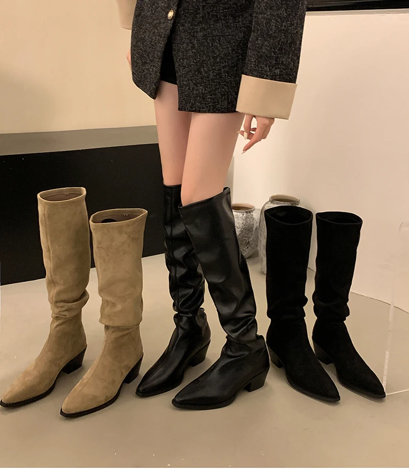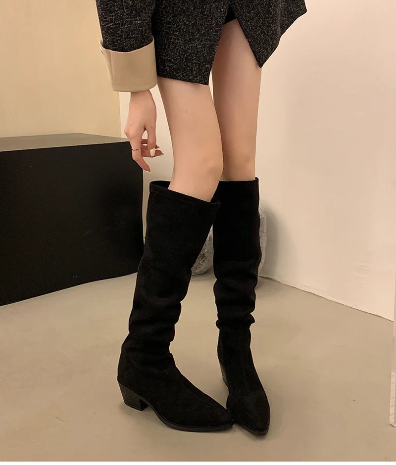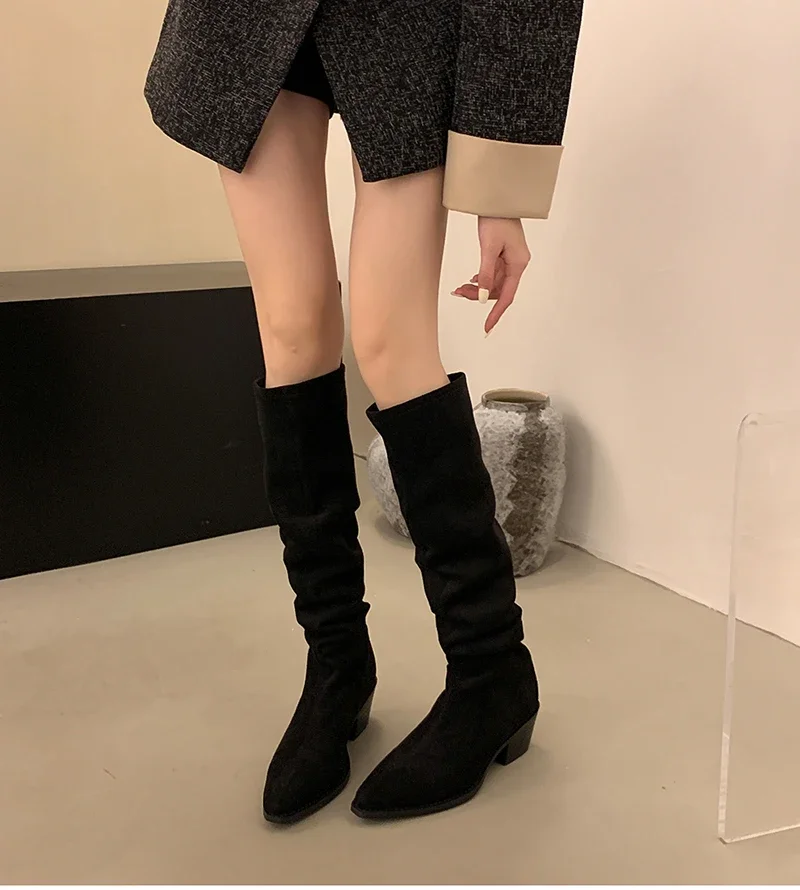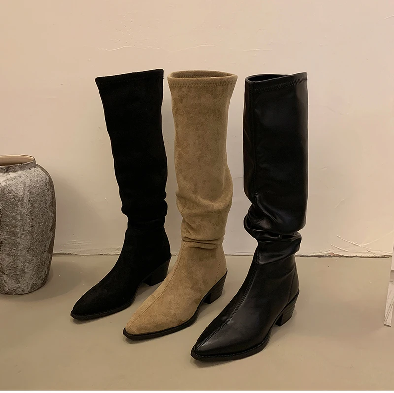 Botines largos Vintage con punta estrecha para mujer, botines por encima de la rodilla, Otoño Invierno, tacón grueso, caballero
