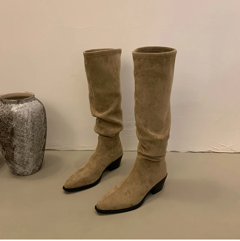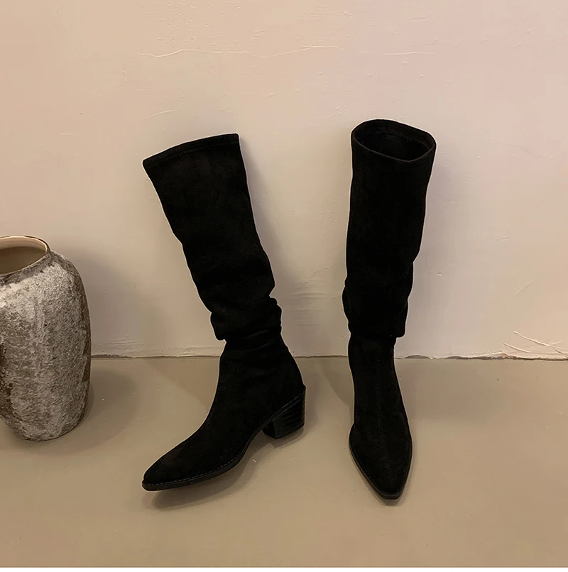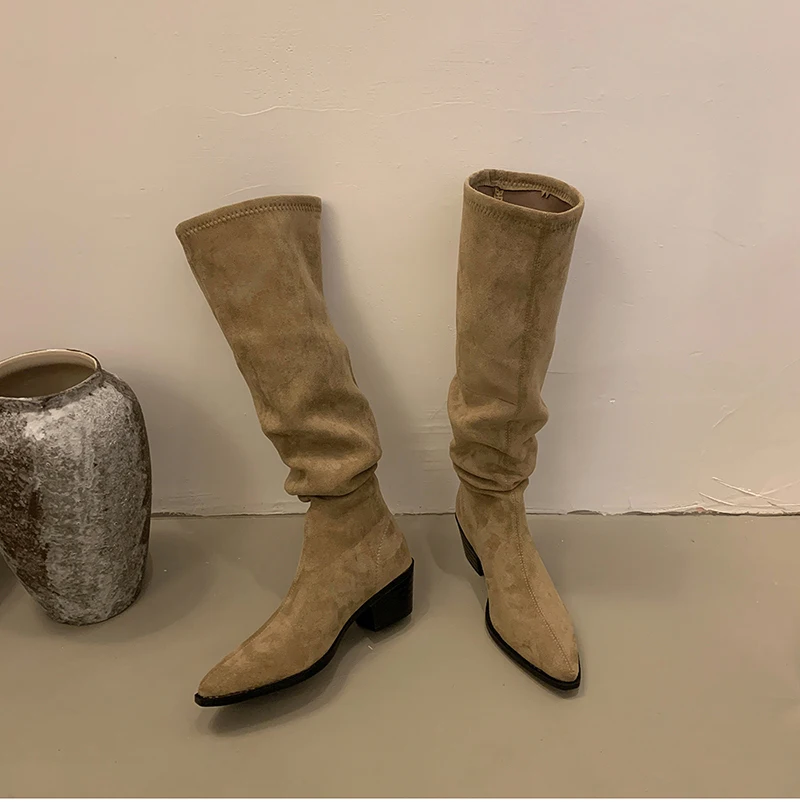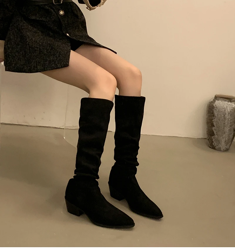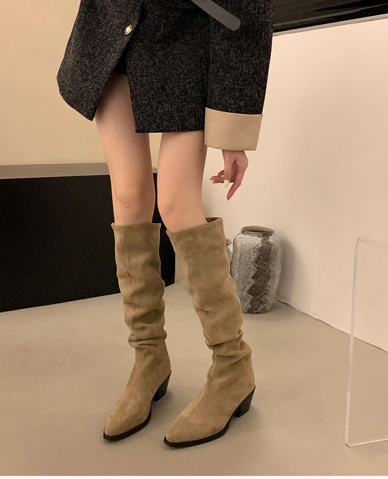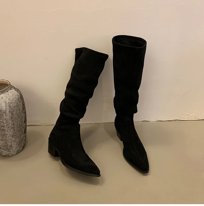 Botines largos Vintage con punta estrecha para mujer, botines por encima de la rodilla, Otoño Invierno, tacón grueso, caballero