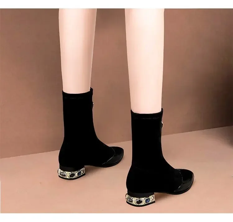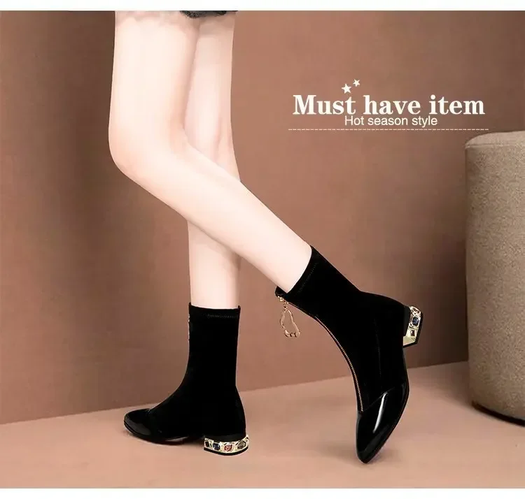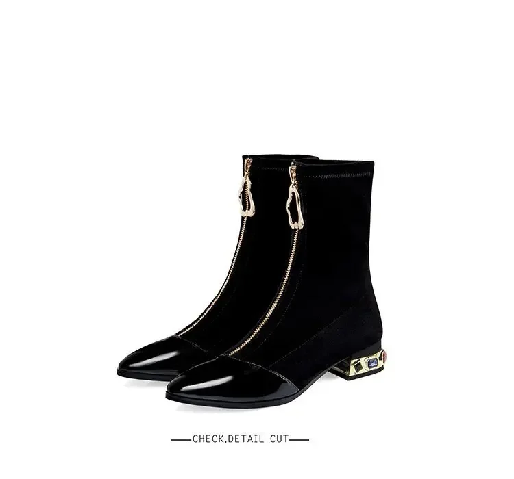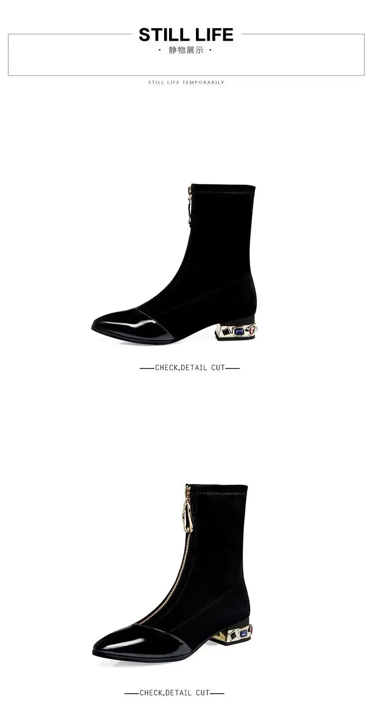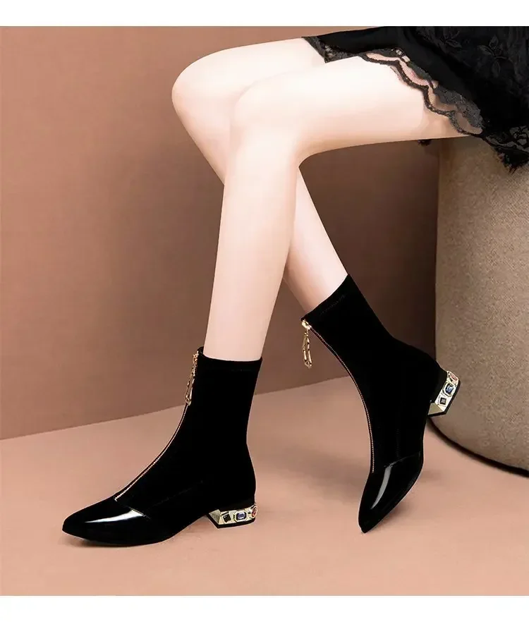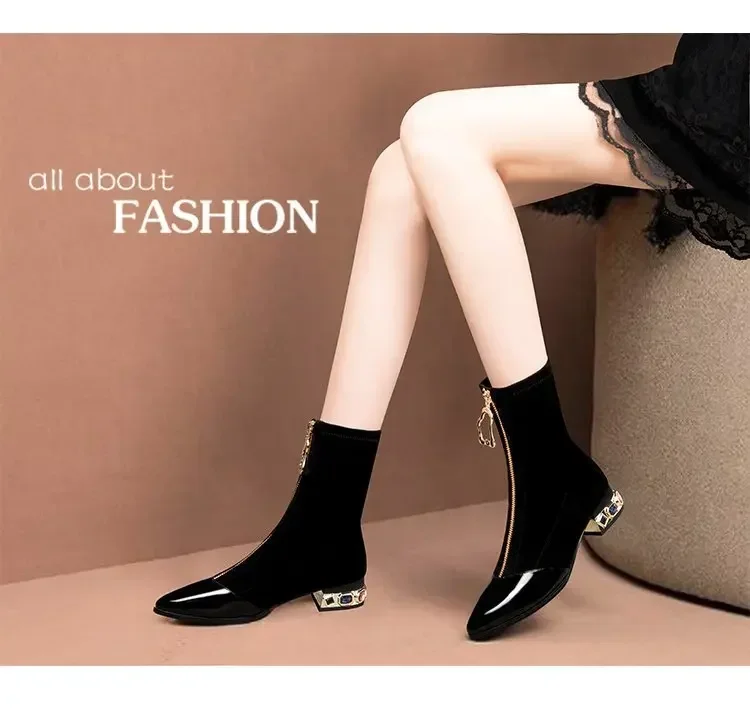 Botines de lentejuelas brillantes para mujer, botas cortas con cremallera frontal puntiaguda, tacones cuadrados de diamantes de imitación, zapatos de motocicleta Retro, moda de invierno, 55
