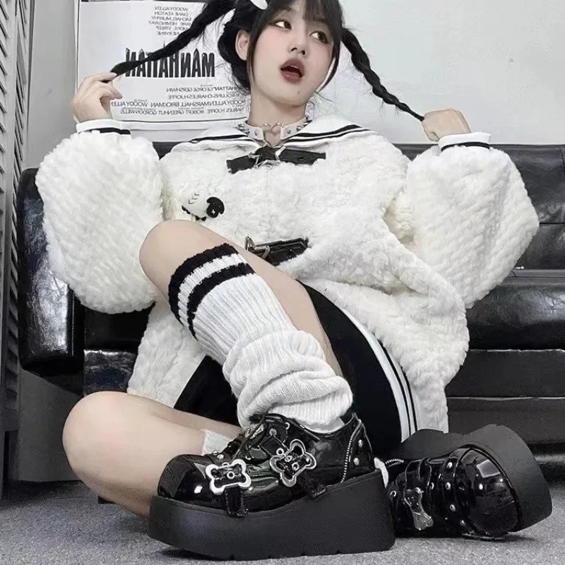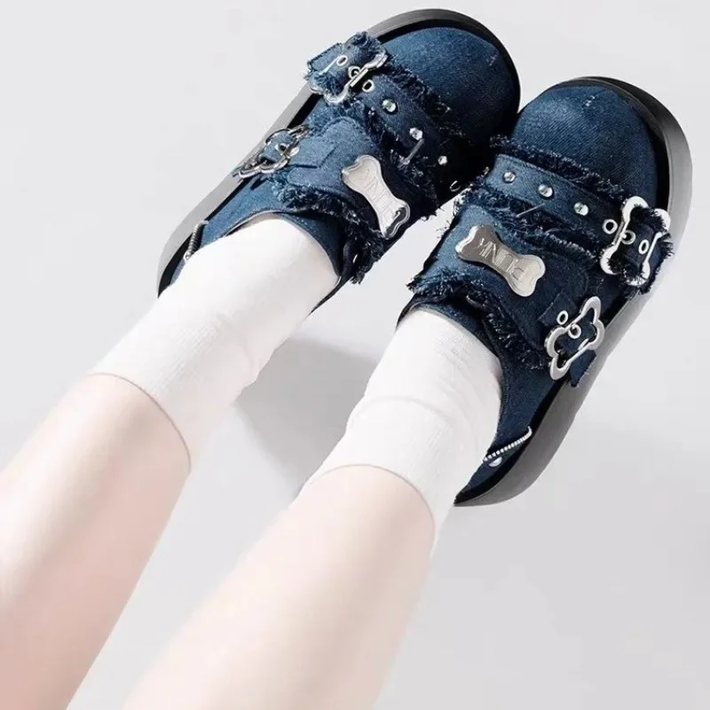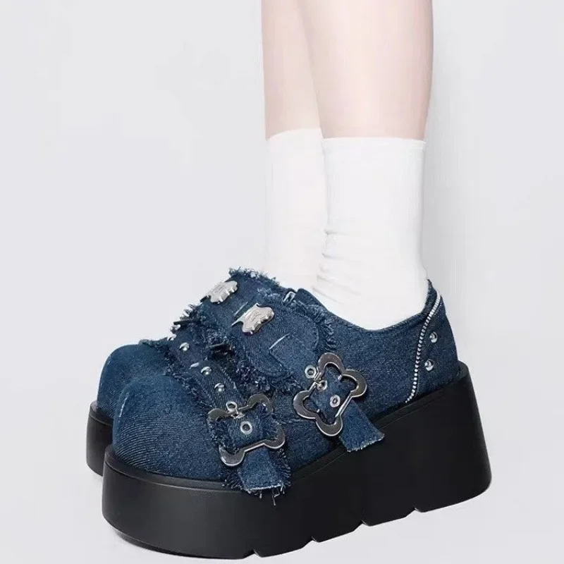 Botines de plataforma gruesa con cadena de Metal Punk para mujer, zapatos vaqueros de fondo grueso Y2K de invierno, zapatos de Lolita góticos negros