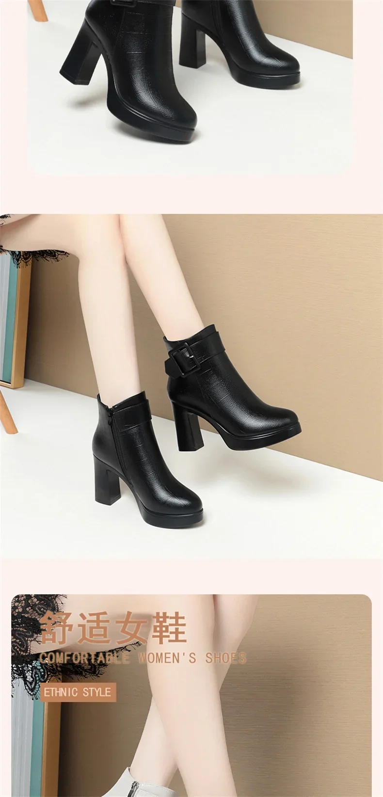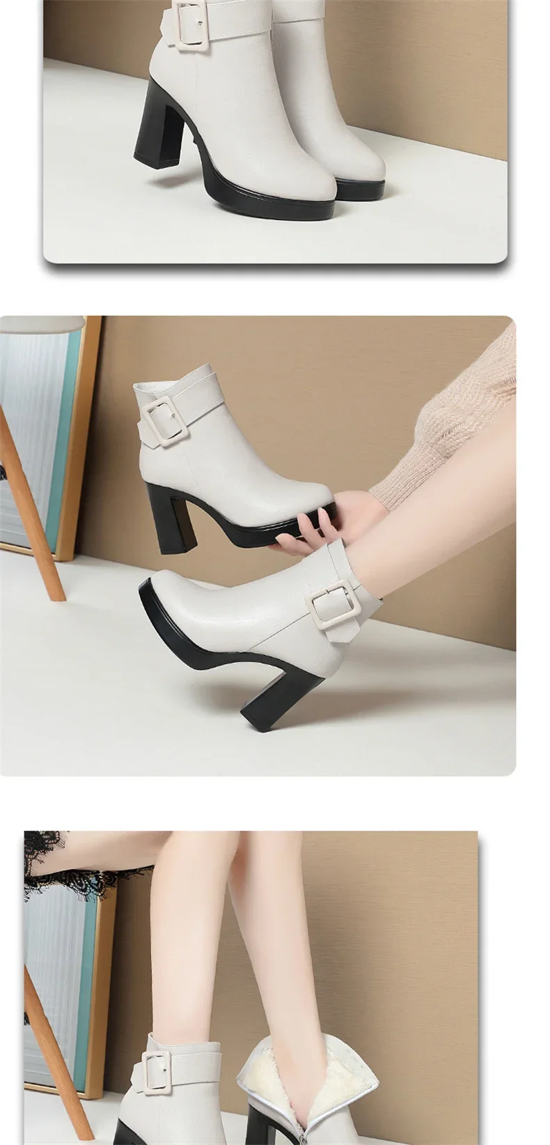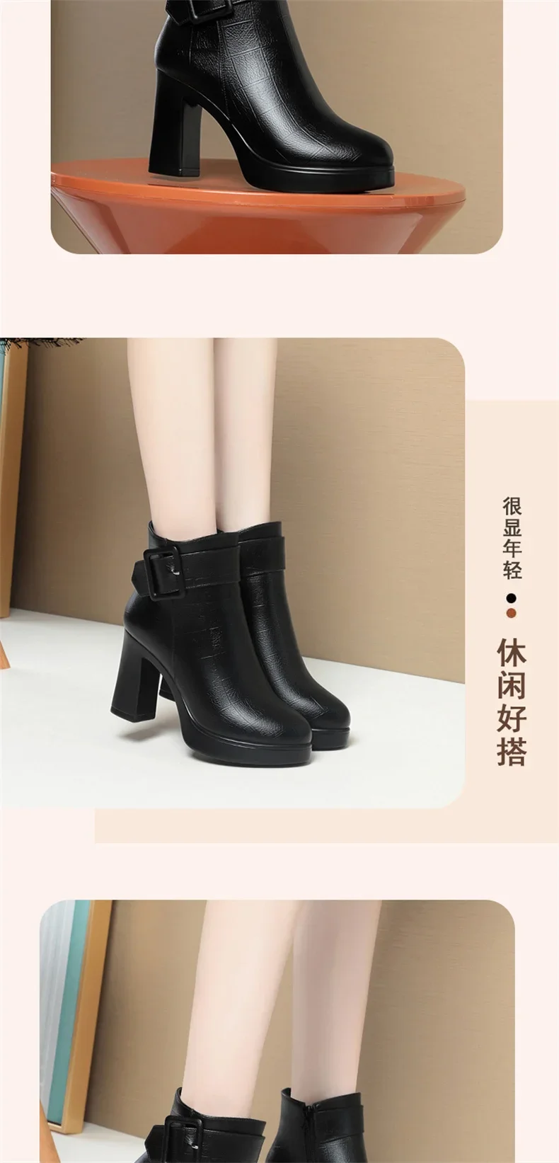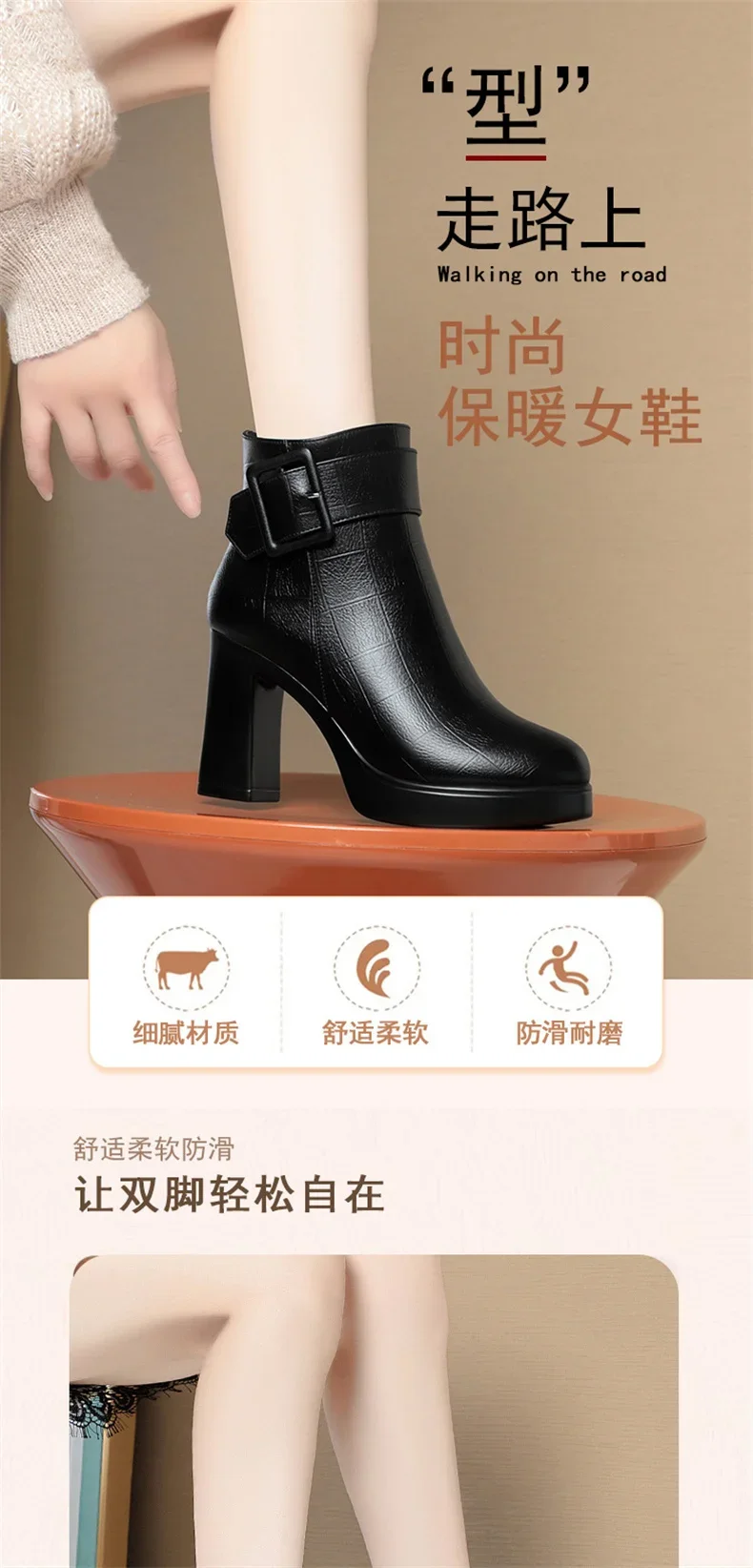 Botines de tacón alto grueso para mujer, botas de cuero con decoración de hebilla corta, elegantes, a la moda, para mantener el calor, color negro, invierno, 2024