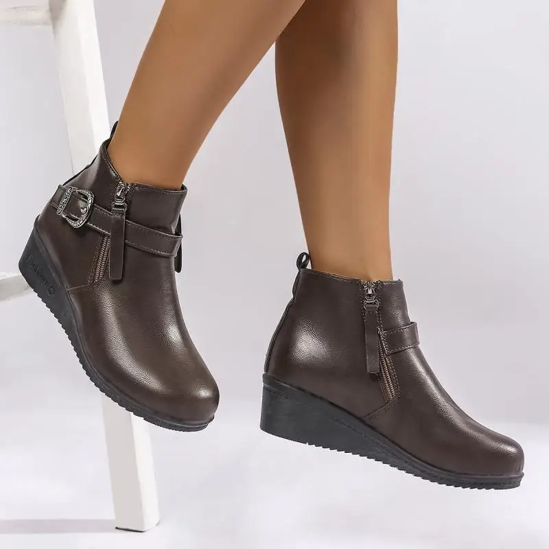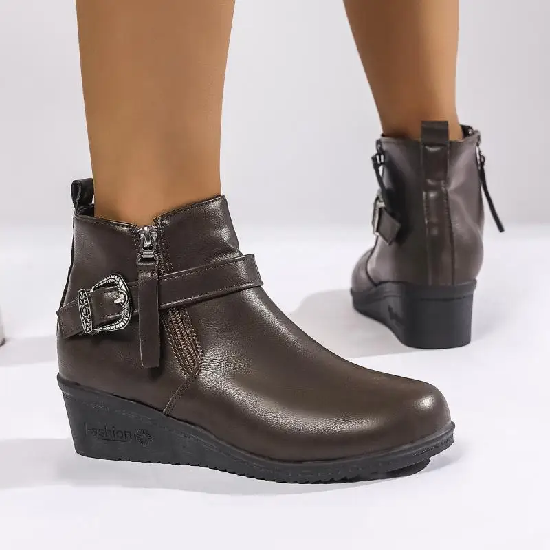 Botines de Tacón de Cuña con hebilla de cinturón de Metal para mujer, botas de vaquero del oeste de cuero Pu Vintage de invierno, botines cortos de talla grande para mujer