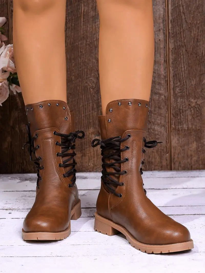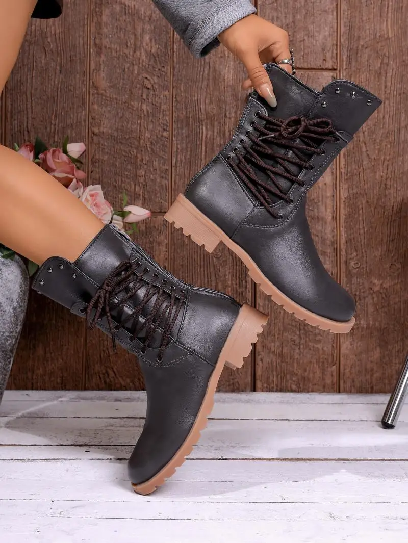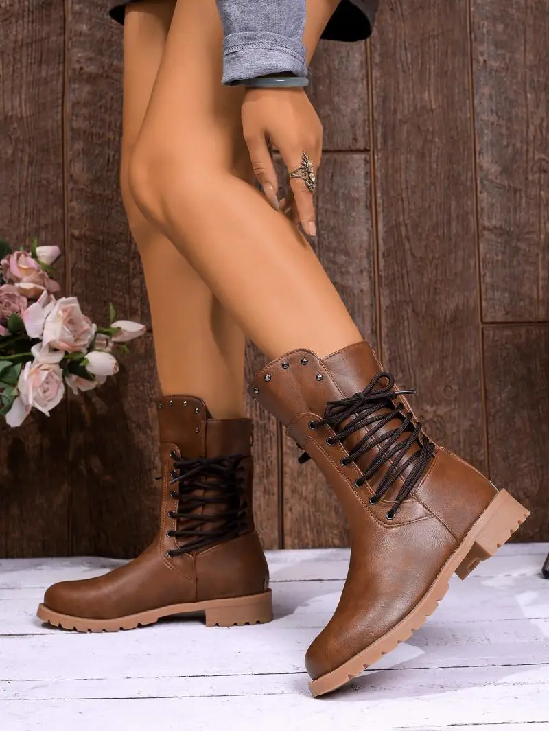 Bottines de Cowboy occidentales Vintage à bretelles croisées pour femme, bottines courtes à rivets Rock et talon épais, nouvelle collection hiver automne