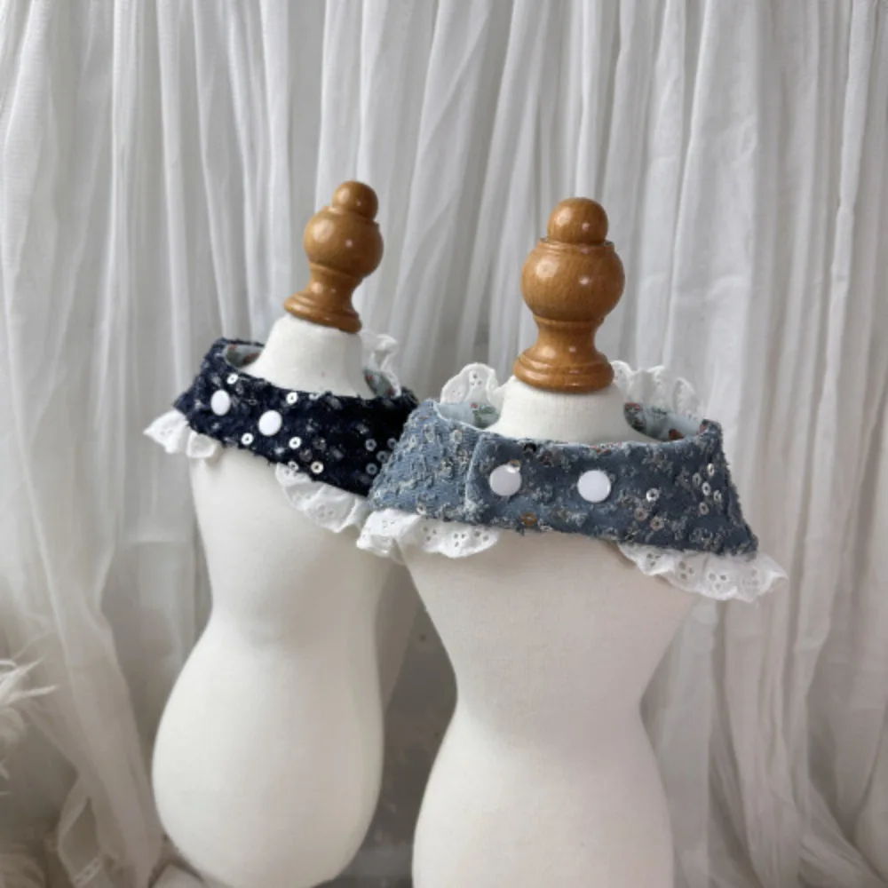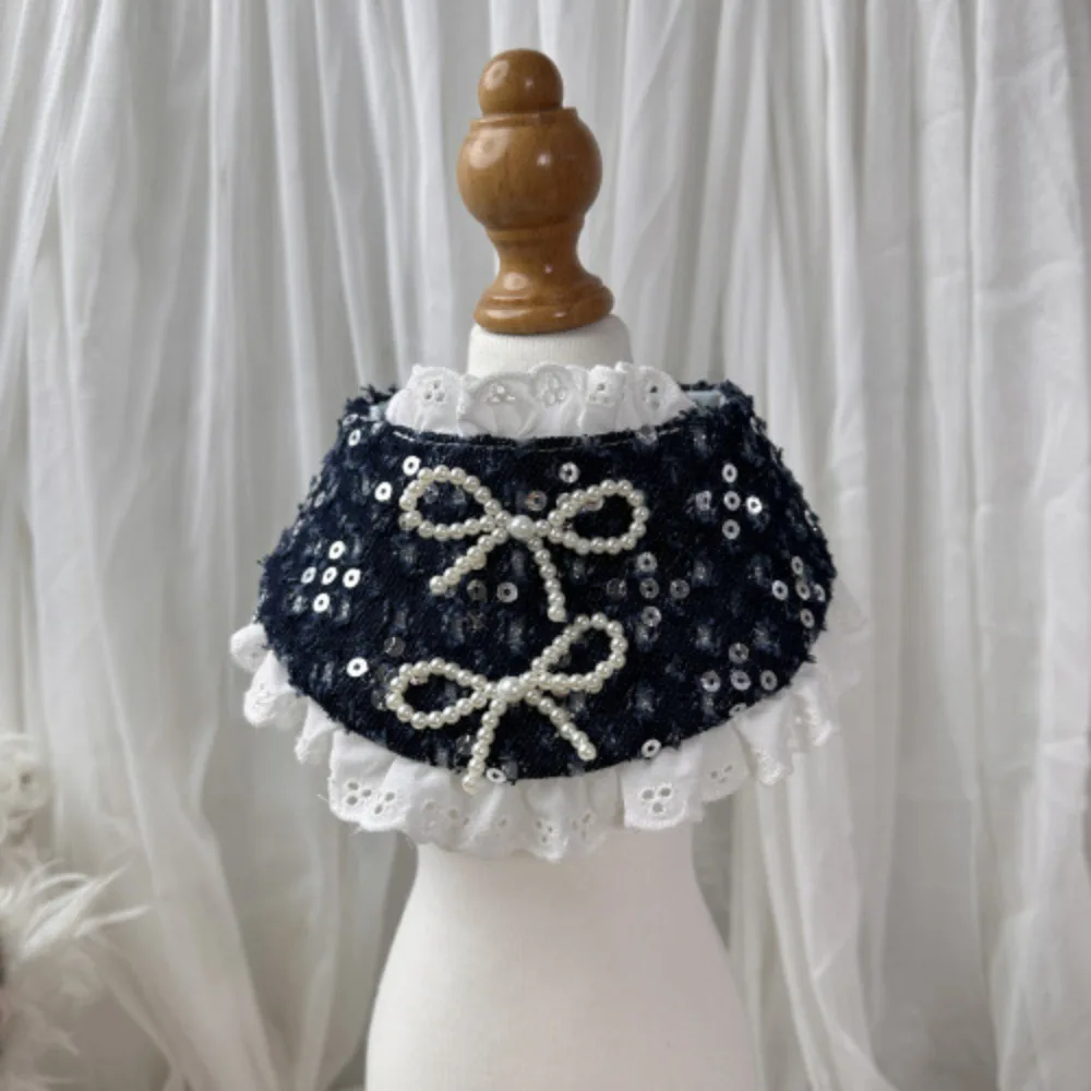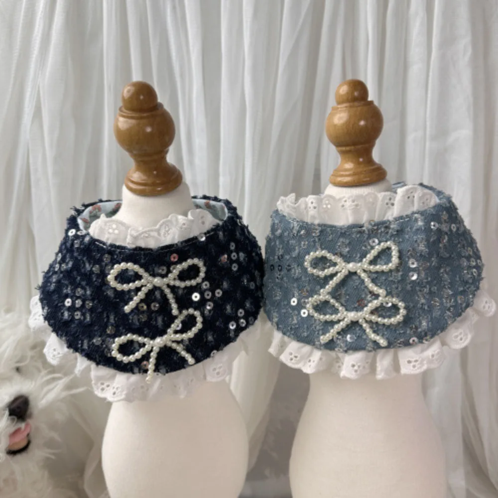 Bufanda de agua de encaje para mascotas con lazo de lentejuelas azul vaquero, bufanda con lazo de perlas para perros y gatos, ropa para perros pequeños, ropa para cachorros