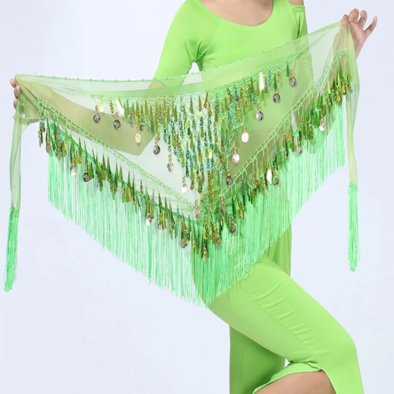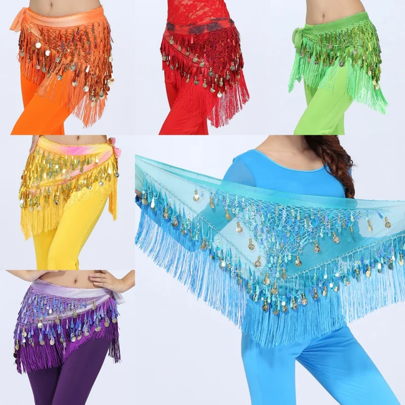 1. Nuevo y de alta calidad, traje de danza del vientre, falda de hip hop, bufanda envuelta en triángulo, borla, cinturón, cadena con tres capas de lentejuelas de monedas.