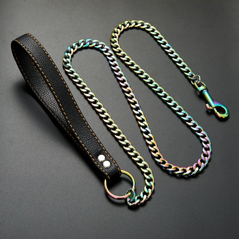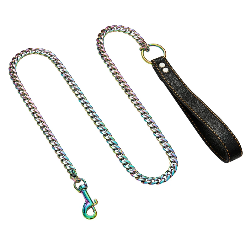 Cadena de Metal resistente a las mordeduras para perros grandes, correa de acero inoxidable, asa de cuero PU, accesorios para mascotas