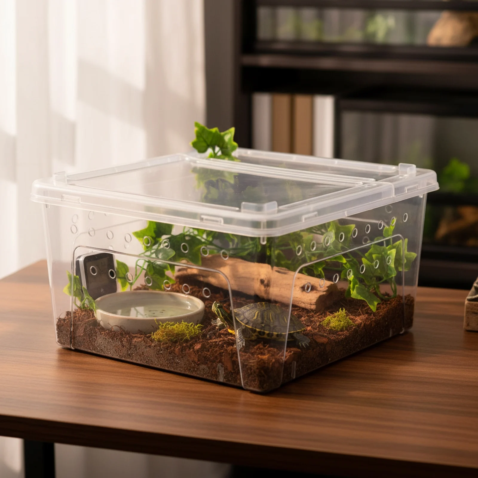 Amplia aplicación: este contenedor de hábitat para reptiles es adecuado para varios anfibios pequeños y reptiles, como tortugas para bebés, tortugas acuáticas, cangrejos ermitentes, cangrejos, etc.