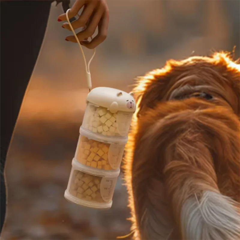 Caja de almacenamiento portátil de plástico multicapa a prueba de humedad para aperitivos para perros, caja de embalaje extraíble de tres capas para alimentos para mascotas sellada