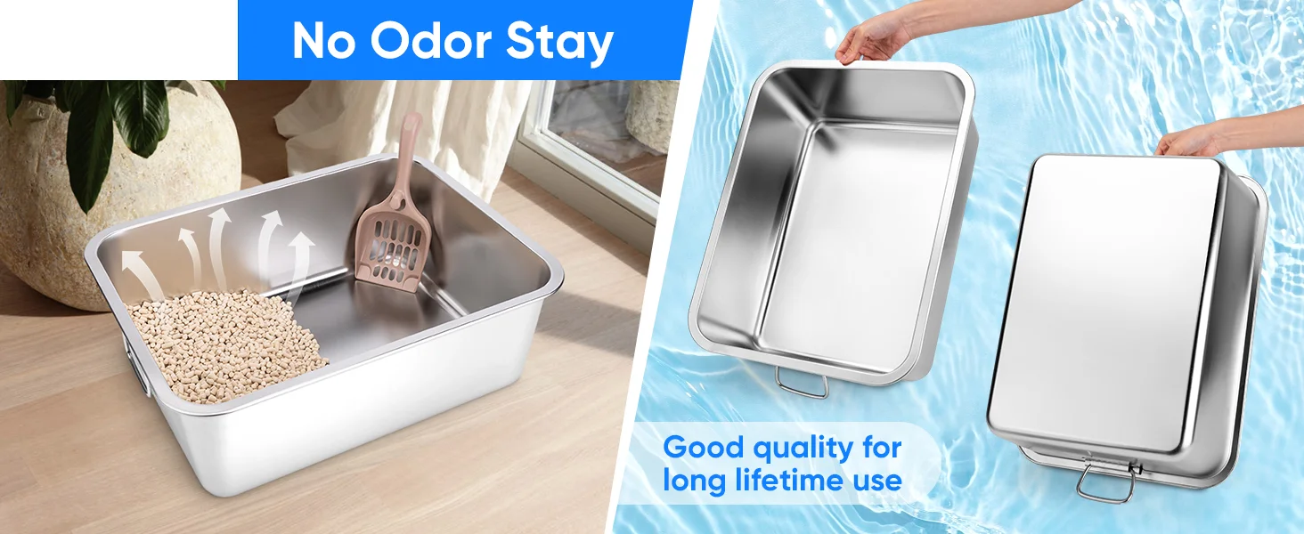Sin olor---- La caja de arena de acero inoxidable con excelente control de olores proporciona un ambiente agradable tanto para gatos como para dueños.