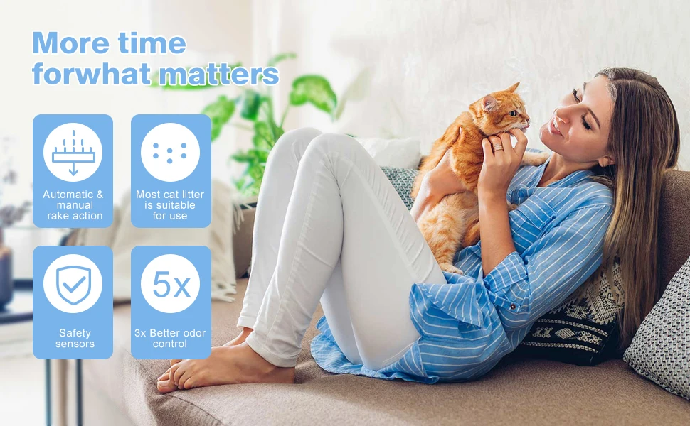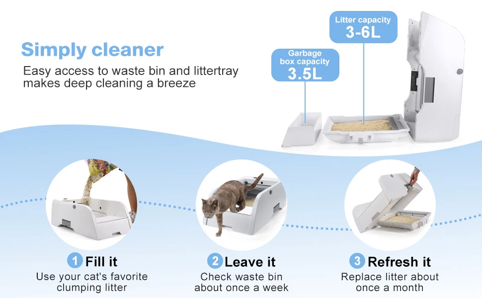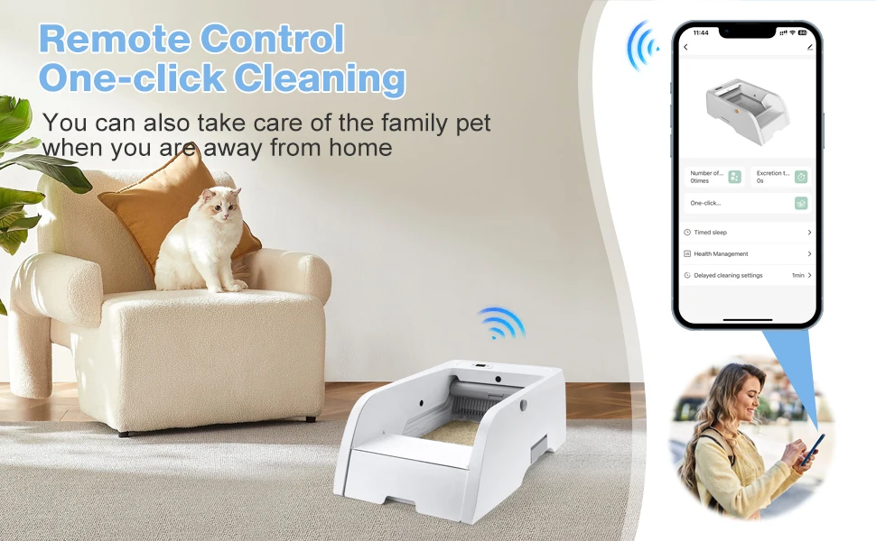 Control inteligente de aplicaciones: la aplicación permite la limpieza con un solo toque, la programación de retrasos, la configuración del modo de suspensión (por lo que la caja de arena detiene el funcionamiento durante la noche) y el monitoreo de la salud (seguimiento del número de veces que su gato usa la caja de arena y cuándo).