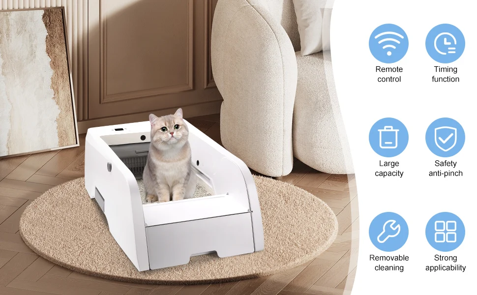 Funciones de seguridad: Equipada con un mecanismo antipellizco y sensores de infrarrojos, esta caja de arena robótica garantiza la seguridad de su gato al evitar lesiones accidentales mientras está en uso.