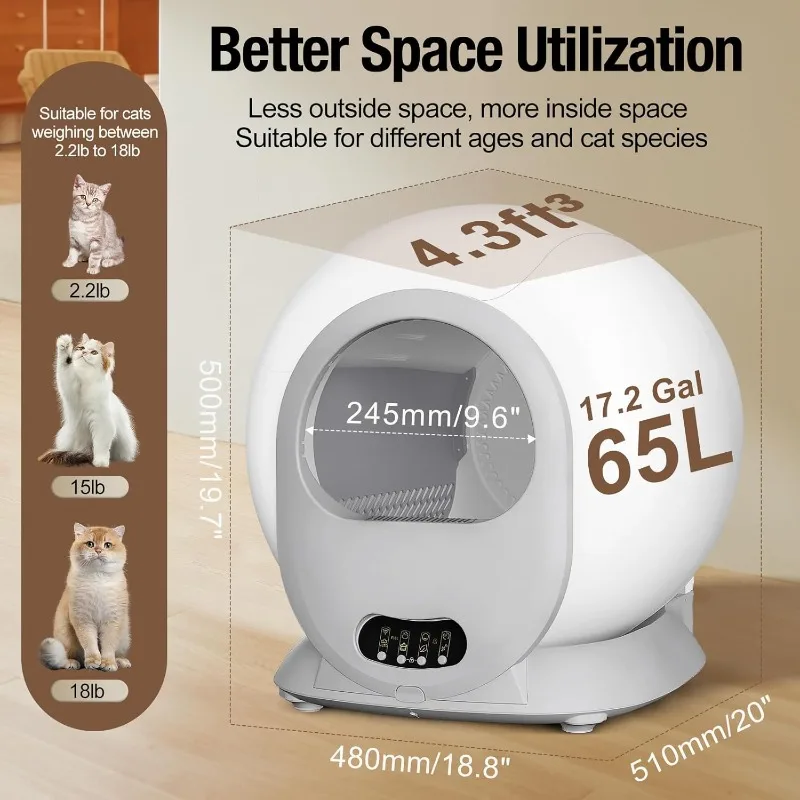 [Uso del espacio] Las dimensiones totales del producto son 18,9" x 20,1" x 19,7", ocupando solo 4,3 pies cúbicos de volumen.A pesar de su tamaño compacto, proporciona a su gato un generoso espacio para el baño de 65 litros.Esto permite a su gato disfrutar de un ambiente de baño espacioso y al mismo tiempo minimizar el impacto en su espacio interior.NOTA: Este producto soporta gatos de 2,2 a 18 libras de peso.