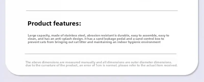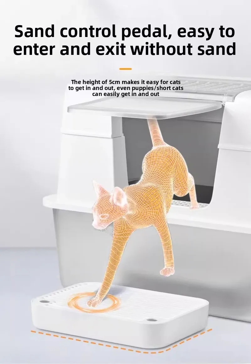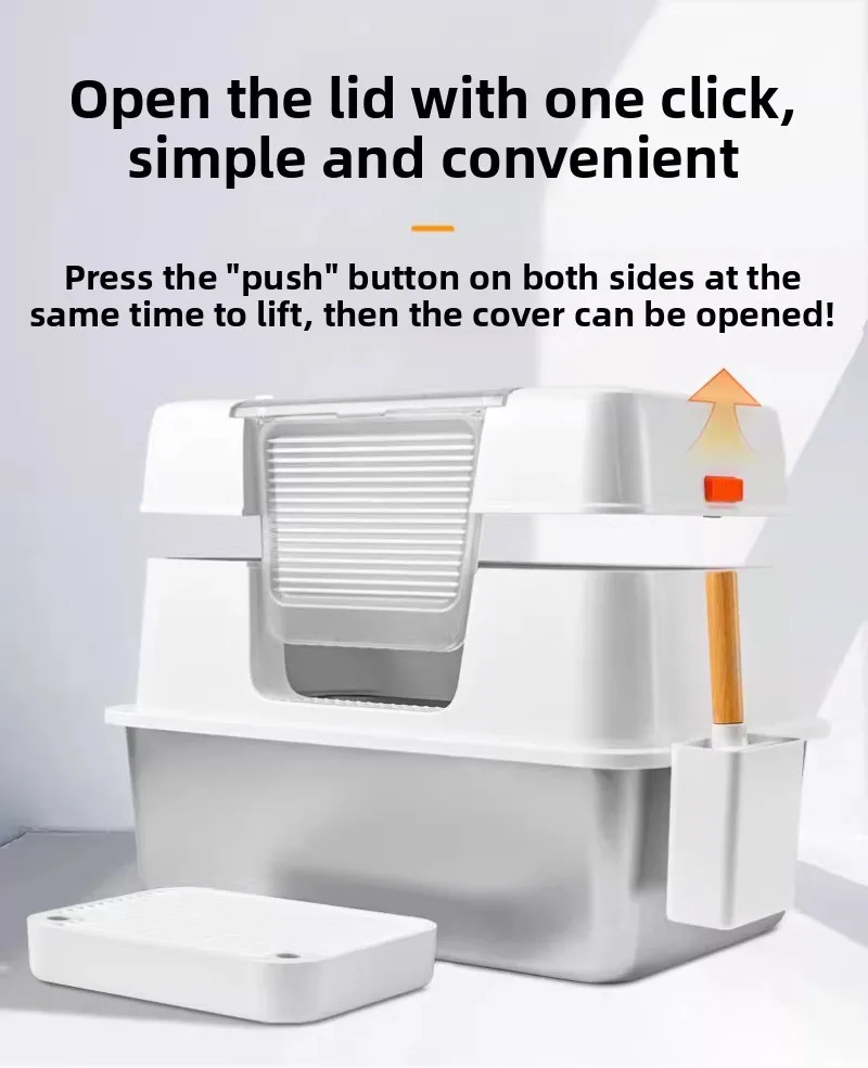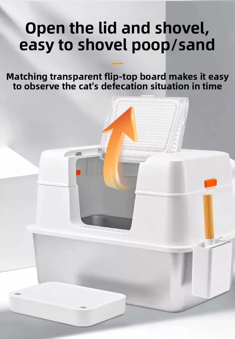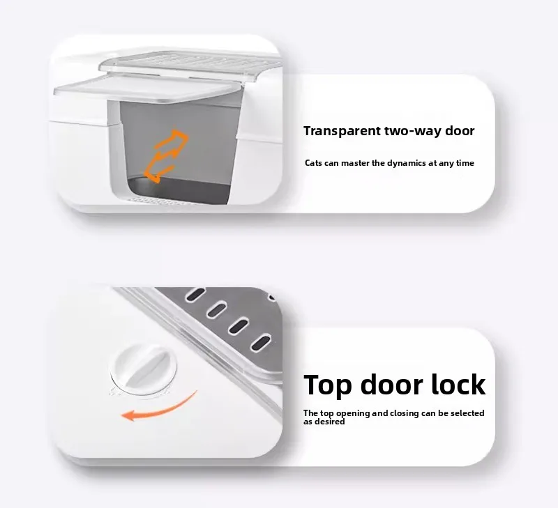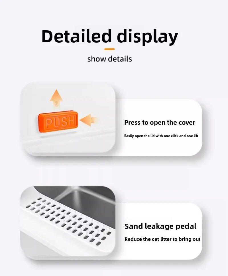Características: 1.Robusto y duradero - gran espacio - fondo antiadherente - aísla el olor 2.360° Lijado de gato completamente cerrado sin salpicaduras. 3.Con una cubierta transparente abatible, es conveniente observar el estado de defecación del gato a tiempo. 4.Altura y profundización, las familias de gatos gordos/multigatos de gran capacidad son muy adecuadas La altura de 5,5 cm es conveniente para que los gatos entren y salgan, y los gatitos/bantam también pueden entrar y salir fácilmente 6.El diseño dividido arriba y abajo se puede lavar directamente 7.¡Presione el botón "PUSH" en ambos lados para levantarlo al mismo tiempo y abrir la tapa!