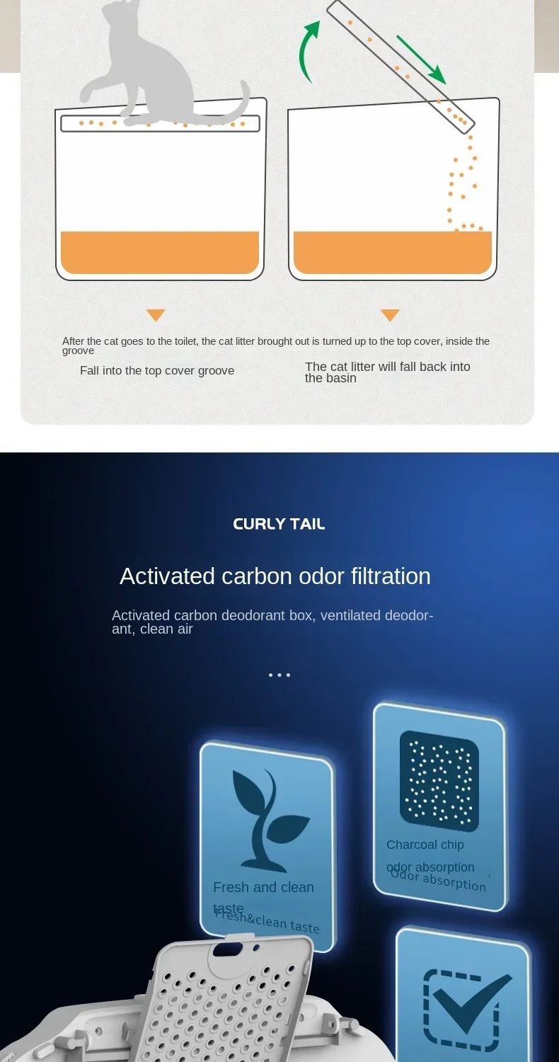Levante la tapa para recoger las heces y retire la arena de la cubierta superior, lo que hace que el reemplazo y la limpieza de la arena sean más convenientes