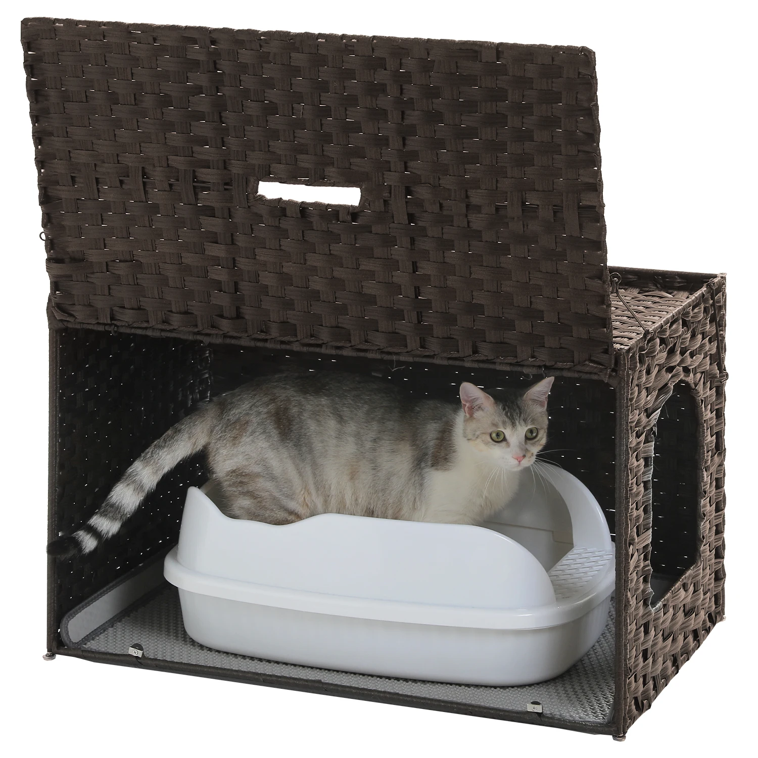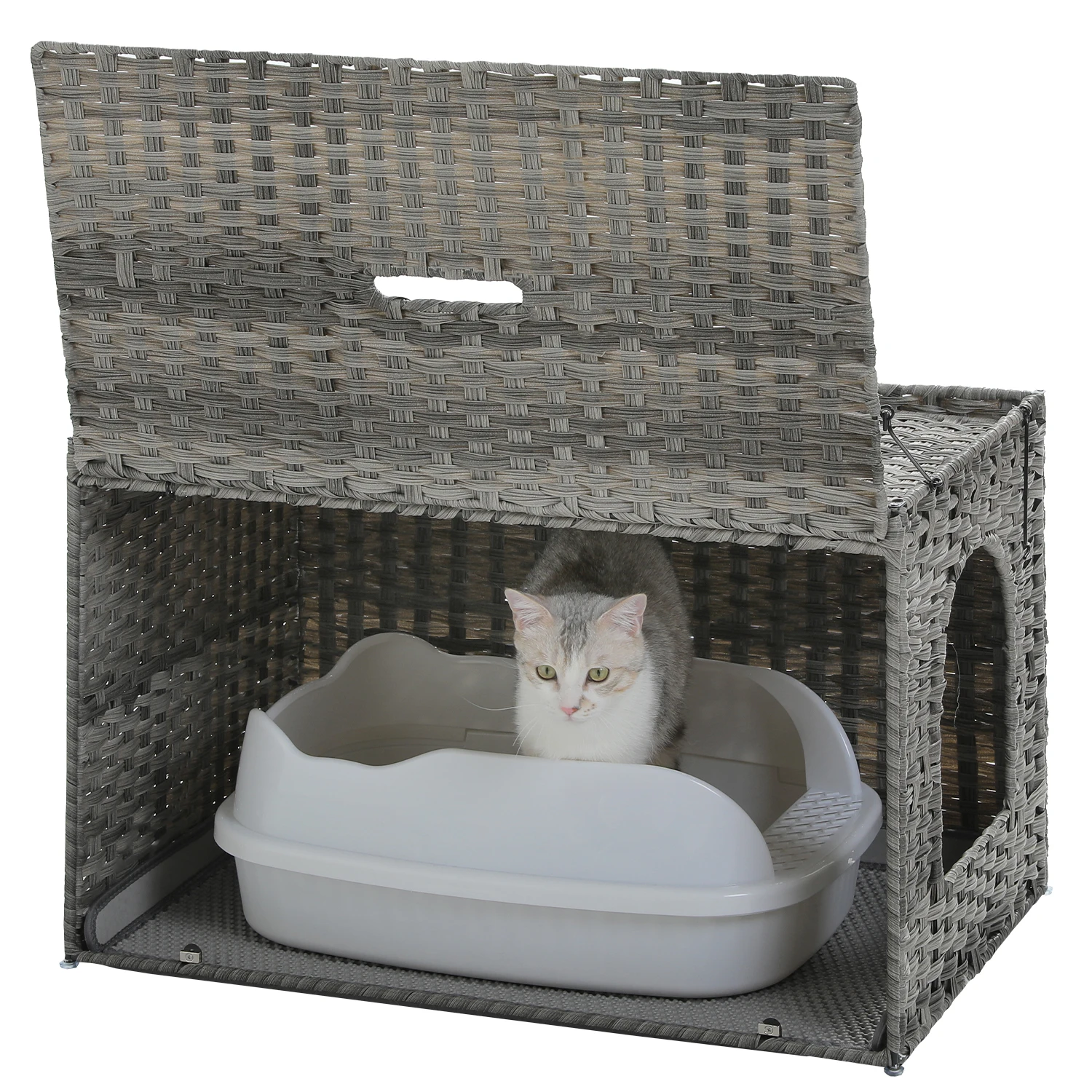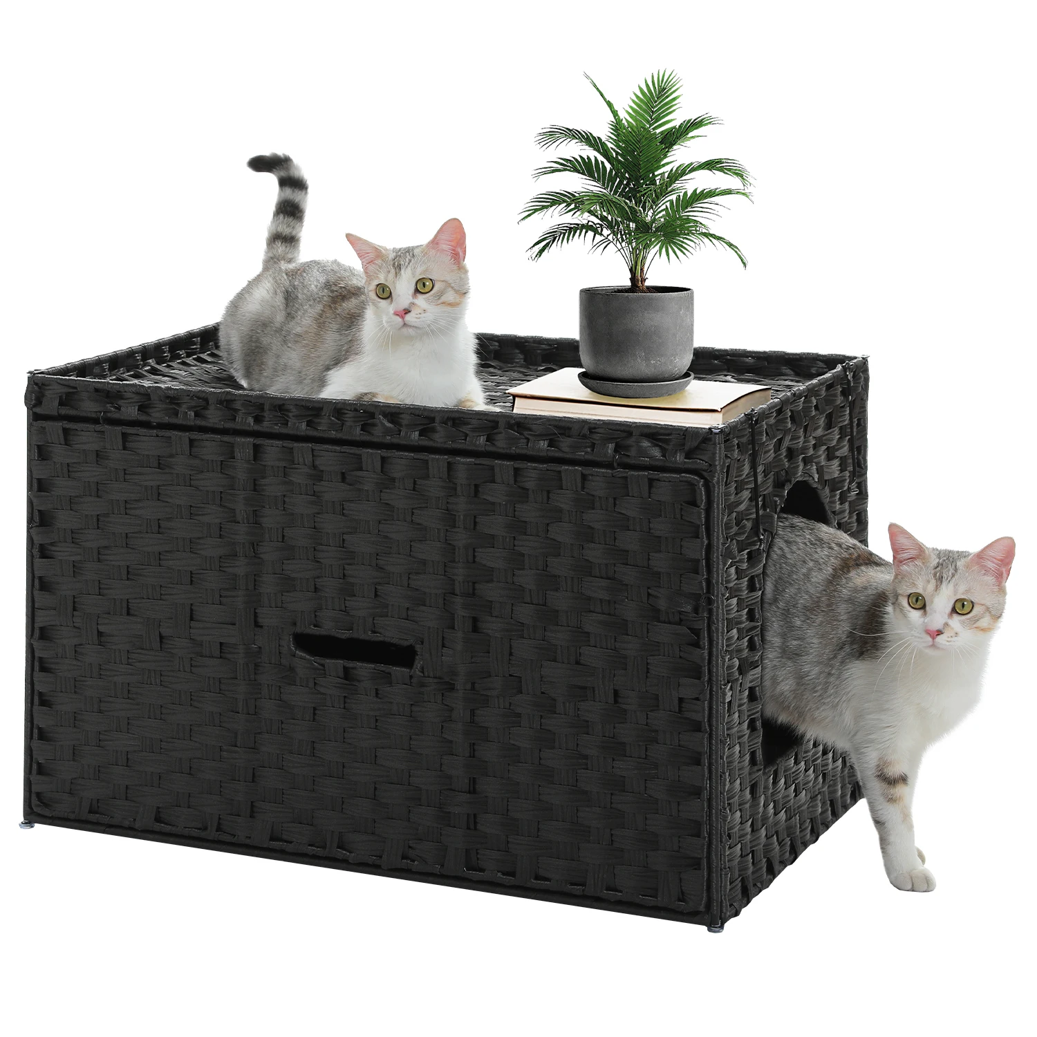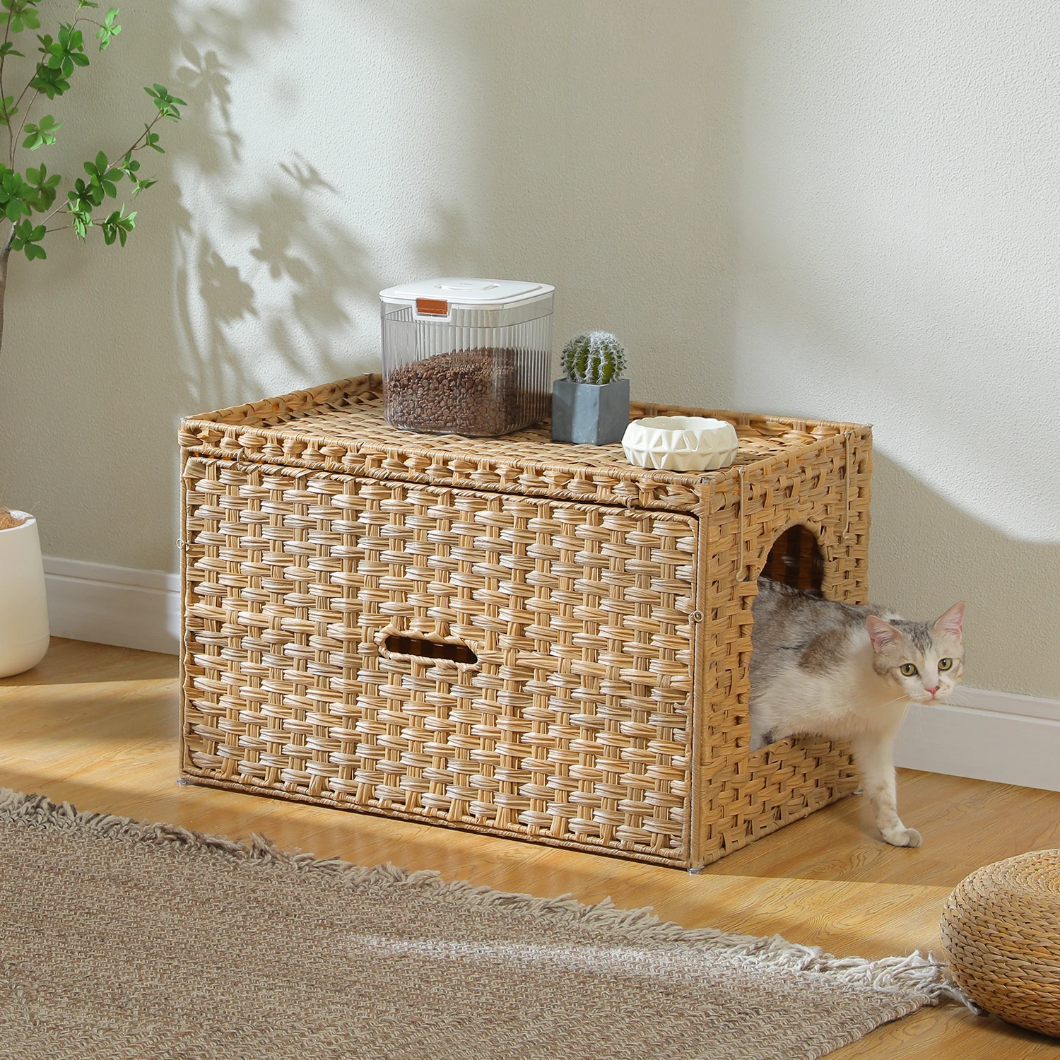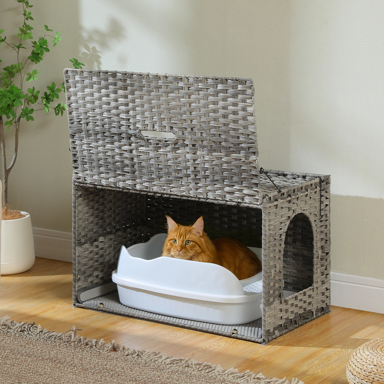 Nombre: Muebles de caja de arena para mascotas para gatos grandes, ratán tejido a mano con puerta, caja de baño para gatos