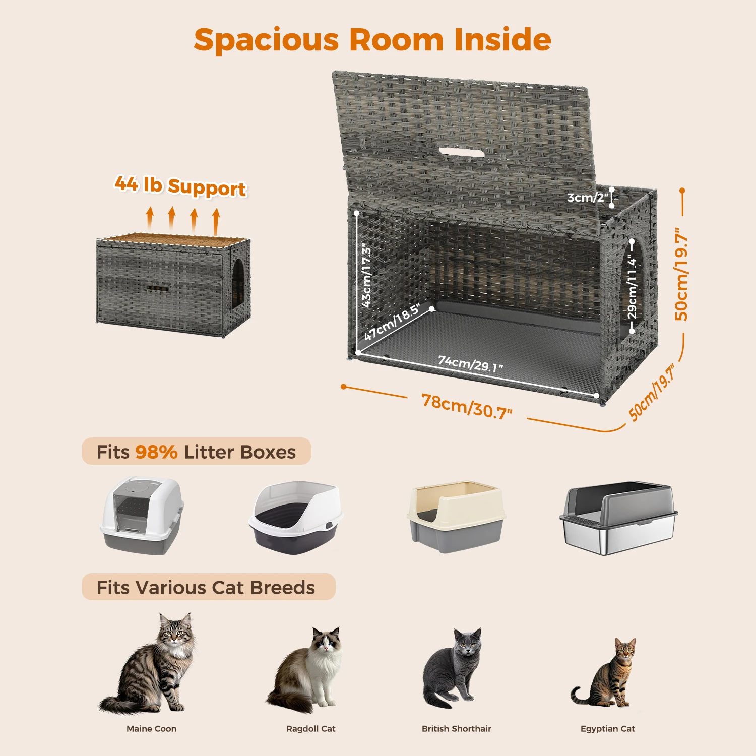 Muebles multiusos y de construcción rápida:Montaje sencillo en 5 minutos con diseño multifuncional Ensamble su caja de arena de ratán para gatos en solo cinco minutos con el manual paso a paso incluido.¡Transforme este mueble con caja de arena en una cama para gatos, una estación de alimentación (la parte superior soporta 44 libras) o una mesa auxiliar!El acabado de ratán neutro complementa la decoración bohemia, de granja o contemporánea.