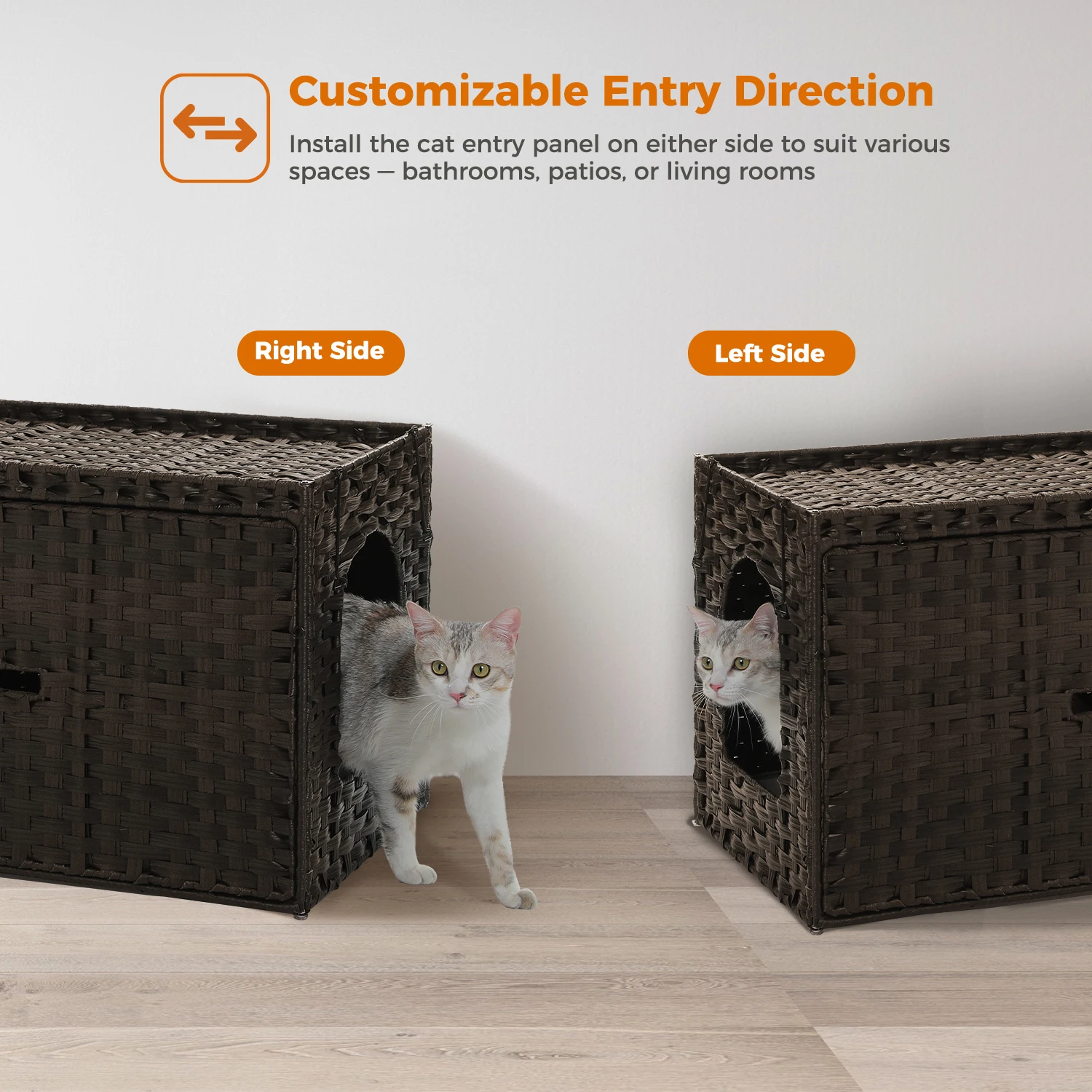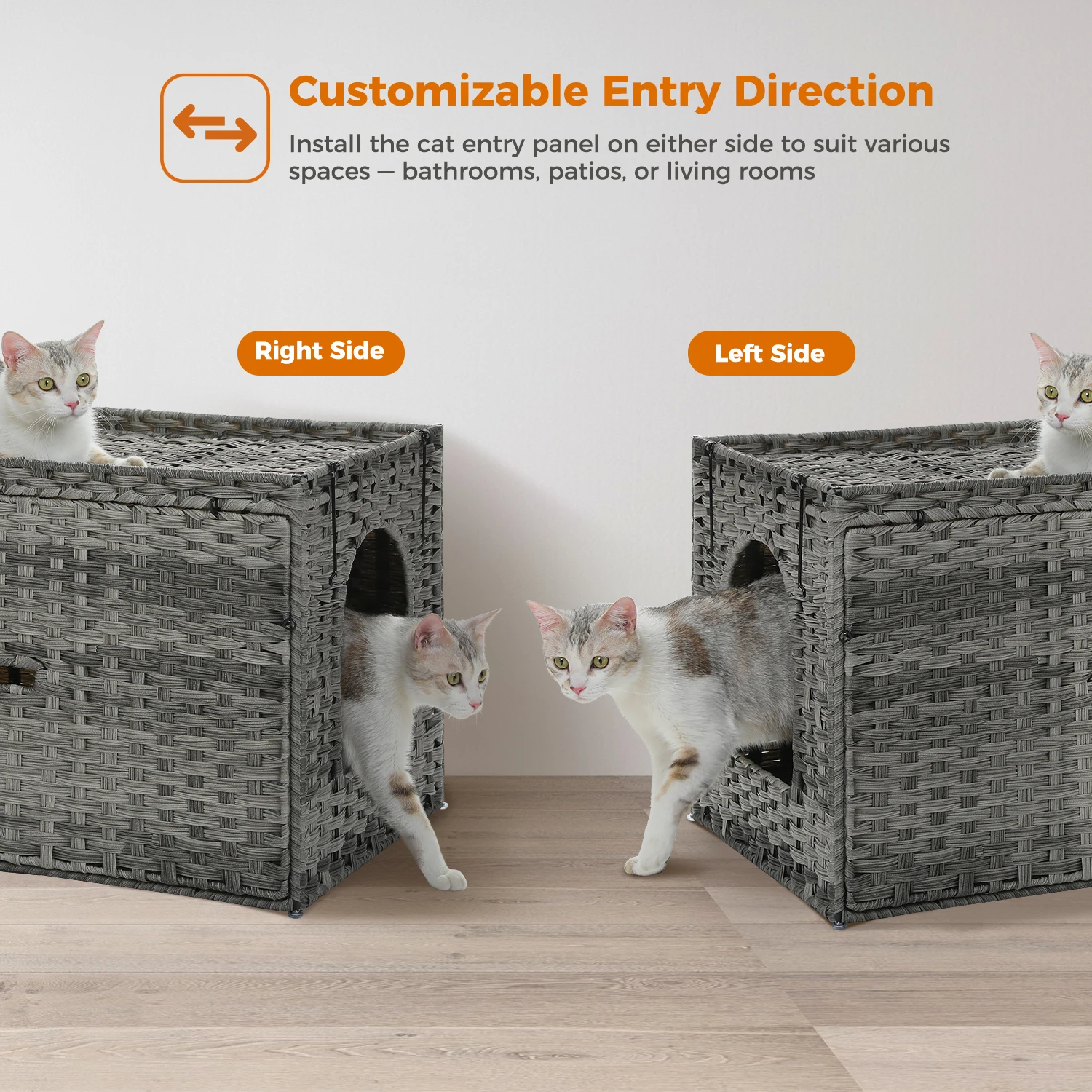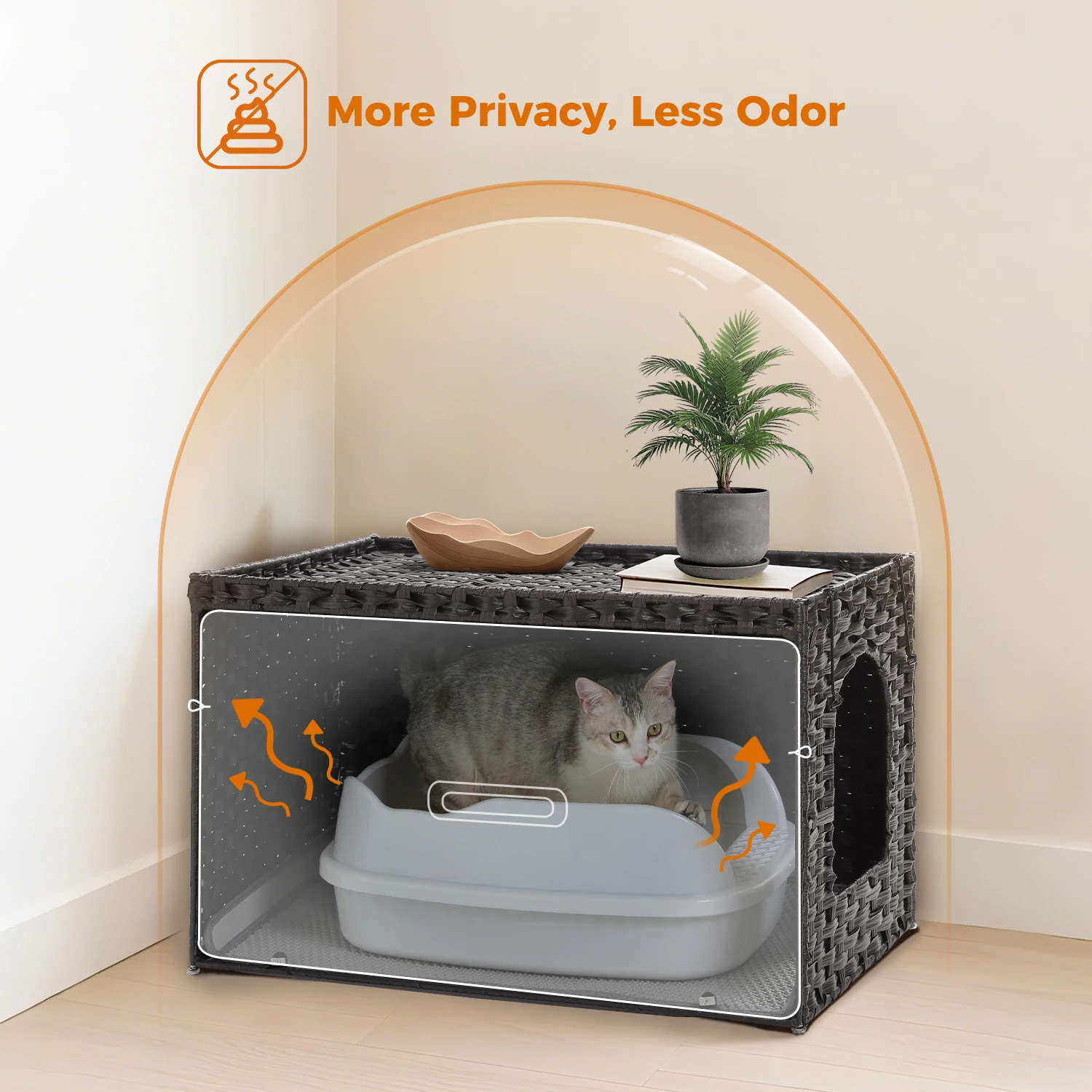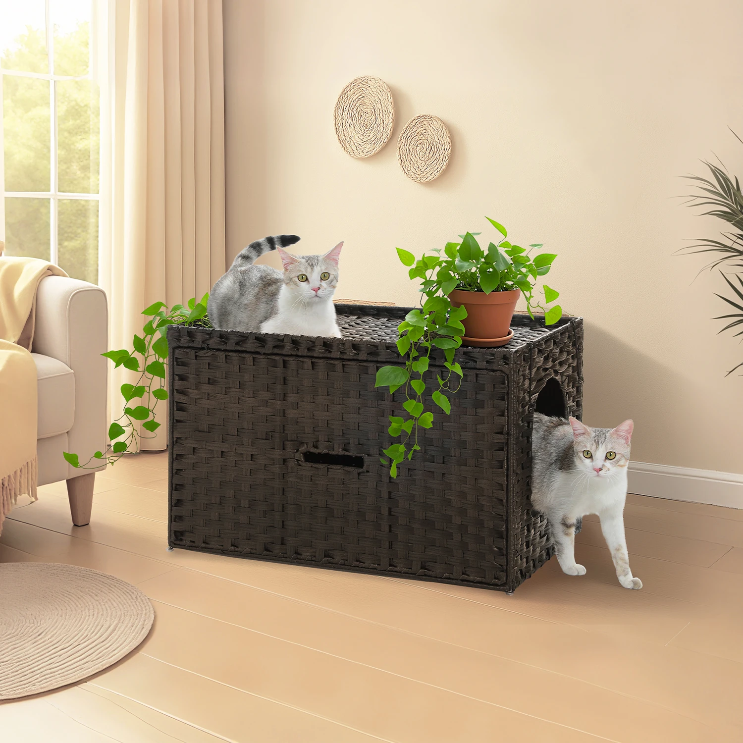 1.Artesanía de ratán tejida a mano: Cada caja de arena para gatos está meticulosamente tejida a mano con ratán de PVC que es impermeable, lavable y resistente, ofreciendo una adición única y elegante a la decoración de su hogar.Incluye una alfombrilla para arena extraíble y lavable, la textura natural no solo mejora la estética sino que también proporciona un ambiente confortable para su amigo felino.