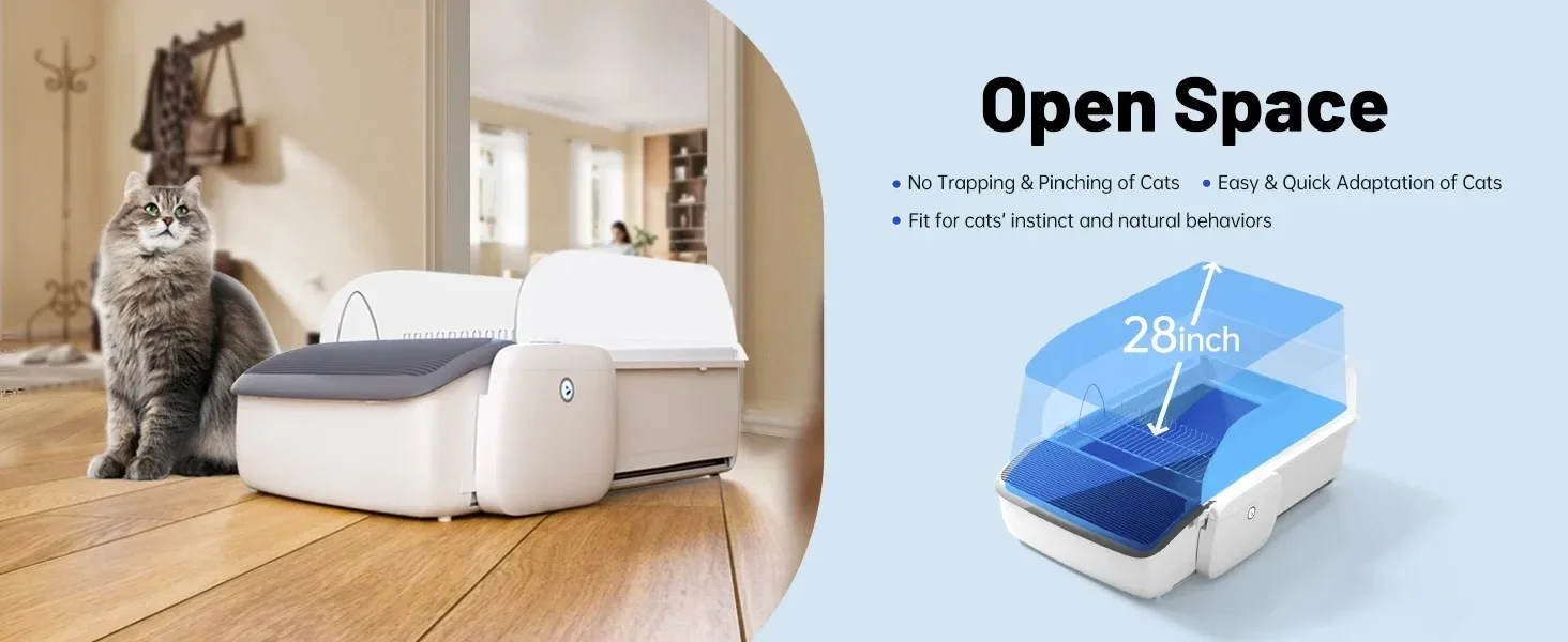 Diseño espacioso y abierto: comodidad apta para gatos: a diferencia de las cajas de arena tradicionales estilo tambor, el M1 Pro presenta un diseño abierto y de lados altos, creando un ambiente cómodo y sin estrés.Su gran capacidad (25,8" de largo x 17,9" de ancho x 11" de alto x 28" de profundidad) se adapta a gatos grandes, gatos mayores y varios gatos con facilidad