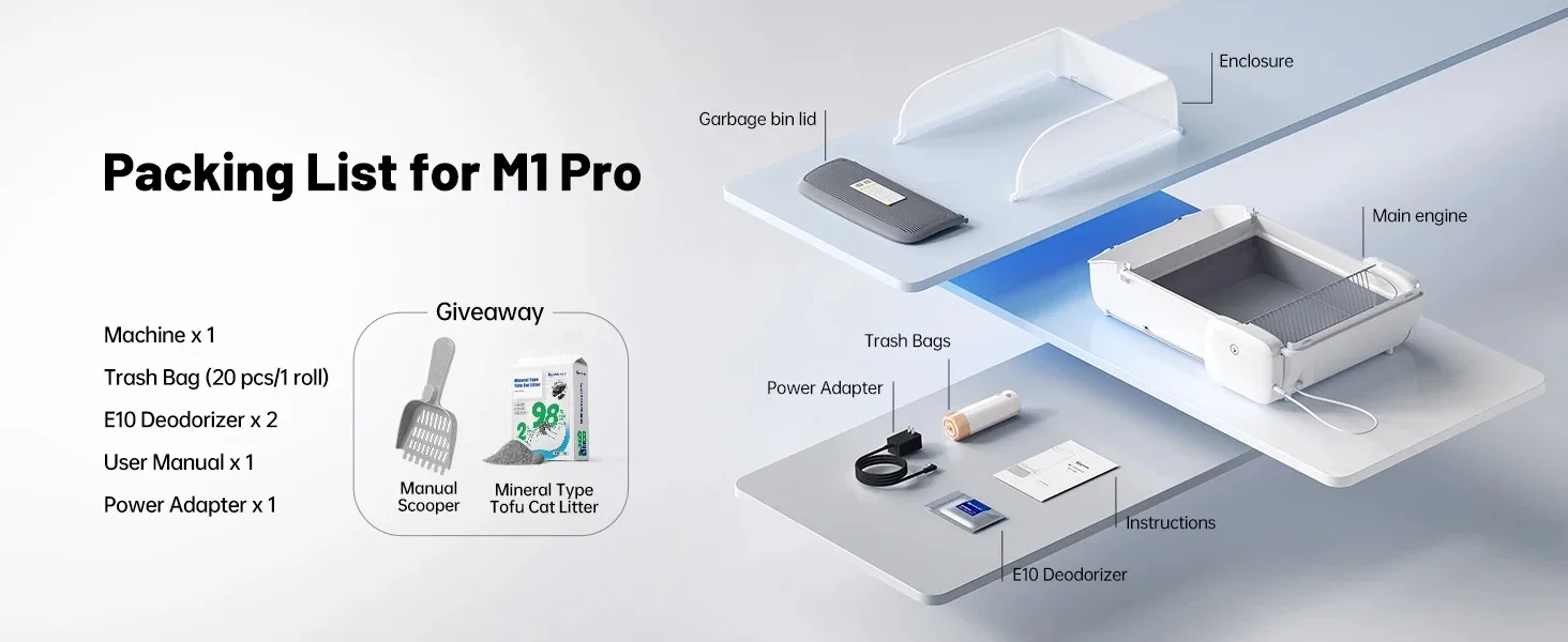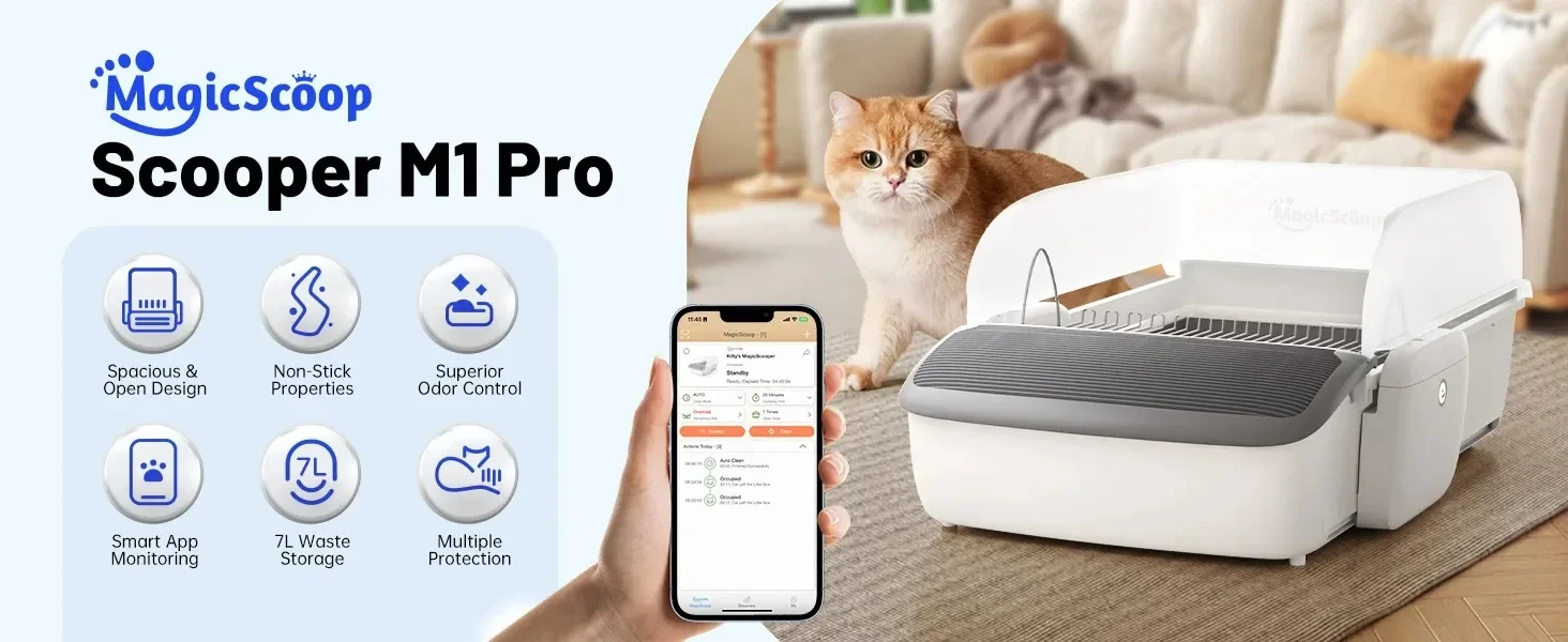 Limpieza automática: no más recogida: MagicScoop M1 Pro es una caja de arena automática avanzada de autolimpieza con tecnología de recogida biónica y tecnología de fondo antiadherente, que elimina la necesidad de recoger.Diseñada para hogares con varios gatos, esta caja de arena manos libres garantiza un ambiente limpio y sin olores, brindándole más tiempo para disfrutar con su mascota.