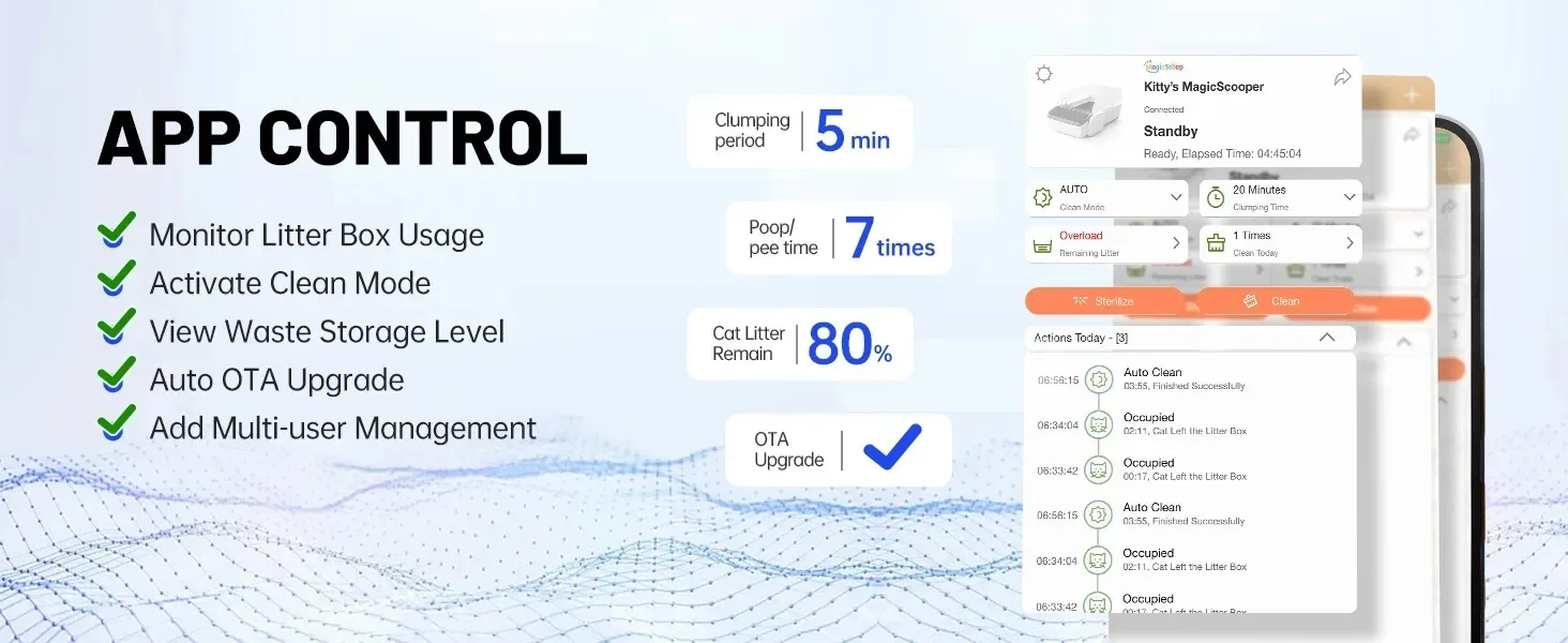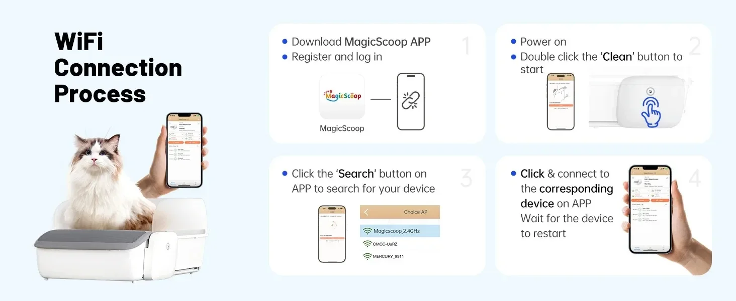 Control inteligente de aplicaciones: monitoree y administre en cualquier lugar: conecte MagicScoop M1 Pro a la aplicación MagicScoop para un control total al alcance de su mano;Limpieza automática: no requiere recogida manual;Eliminación de residuos con un solo toque: reemplazo de basura sin esfuerzo;Monitoreo de salud: realice un seguimiento del uso de la caja de arena para la detección de la salud temprana;Acceso multiusuario: comparta con miembros de la familia (Soportes 2.Sólo WiFi de 4 GHz)