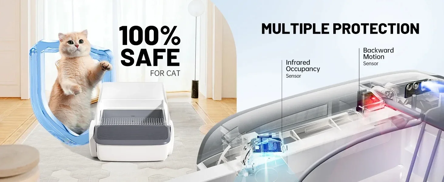 Sensores de seguridad inteligentes: la seguridad para gatos es lo primero: equipado con sensores de movimiento infrarrojos, el M1 Pro detecta la presencia de su gato y pausa los ciclos de limpieza para evitar cualquier riesgo de atrapar o pellizcar.Su funcionamiento silencioso garantiza una noche de sueño tranquilo, lo que la convierte en la mejor caja de arena inteligente silenciosa para su hogar.