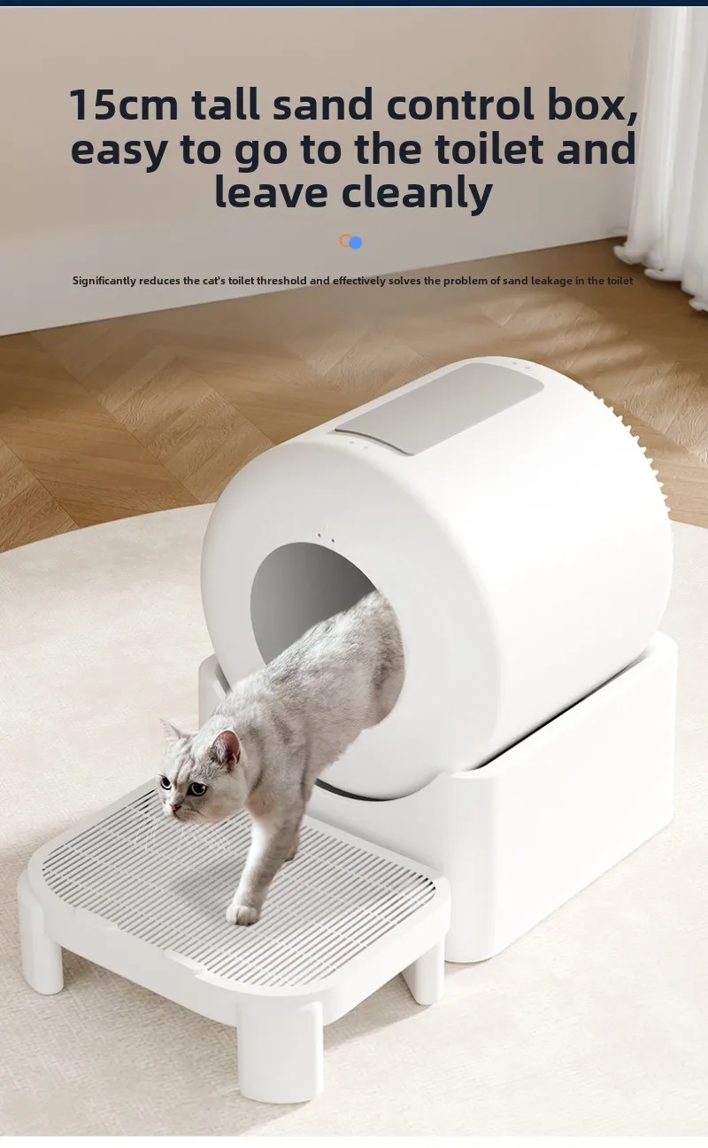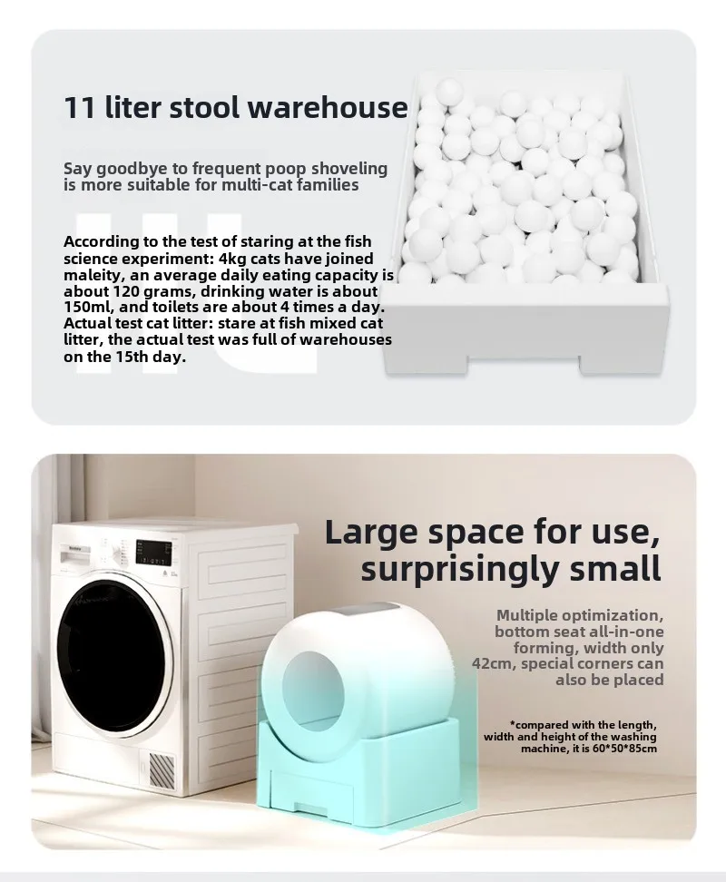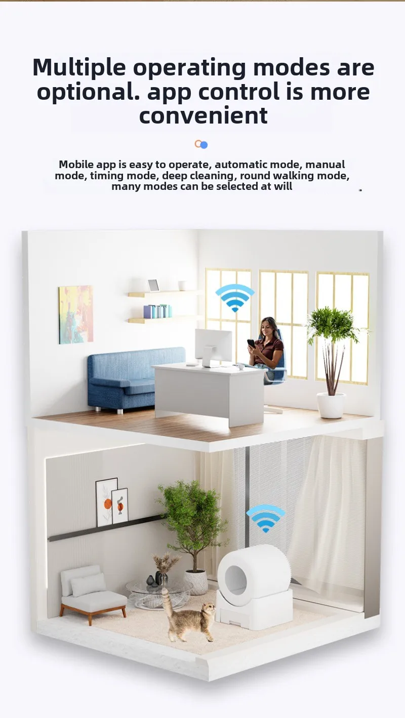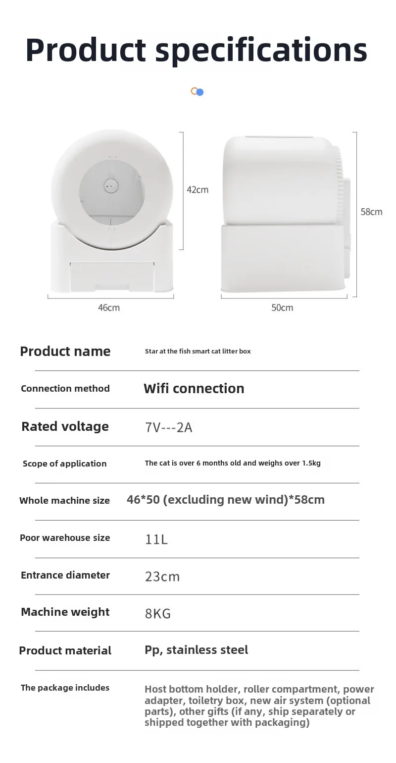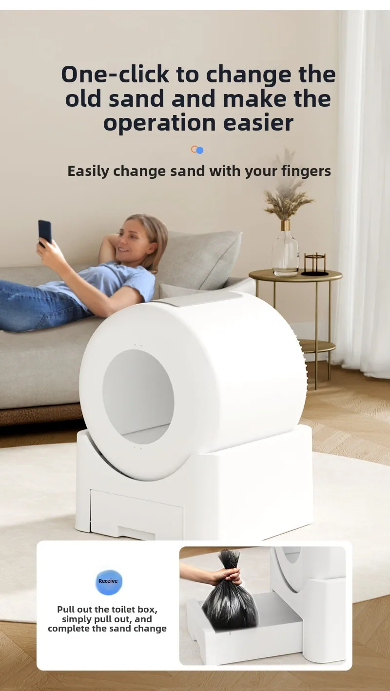 Description:Smart cat litter box, oversized, fully enclosed, splash-proof, fully automatic cleaning, deodorizing electric cat toilet Features: 1. APP remote control, a variety of modes are optional, automatic shit shoveling, one-click sand change 2. One-click replacement of old sand operation is simpler 3. A variety of operation modes can be selected for APP control, which is more convenient Mobile APP easy to operate, automatic mode, manual mode, timing mode, deep cleaning, round sky mode, many modes to choose from 4. Large inner cabin + bottom threshold + large entrance The space is large enough, suitable for fat cats, not only the price threshold is low, but also the entrance threshold is low 5.11 liter toilet Say goodbye to frequent shoveling, more suitable for multi-cat families 6. The use space is large, the area is surprisingly small, and it has been optimized many times. The base is integrally formed, and the width is only 42cm. It can also be placed in corners and corners. 7. Scientific deodorization design drives away odors and refreshes