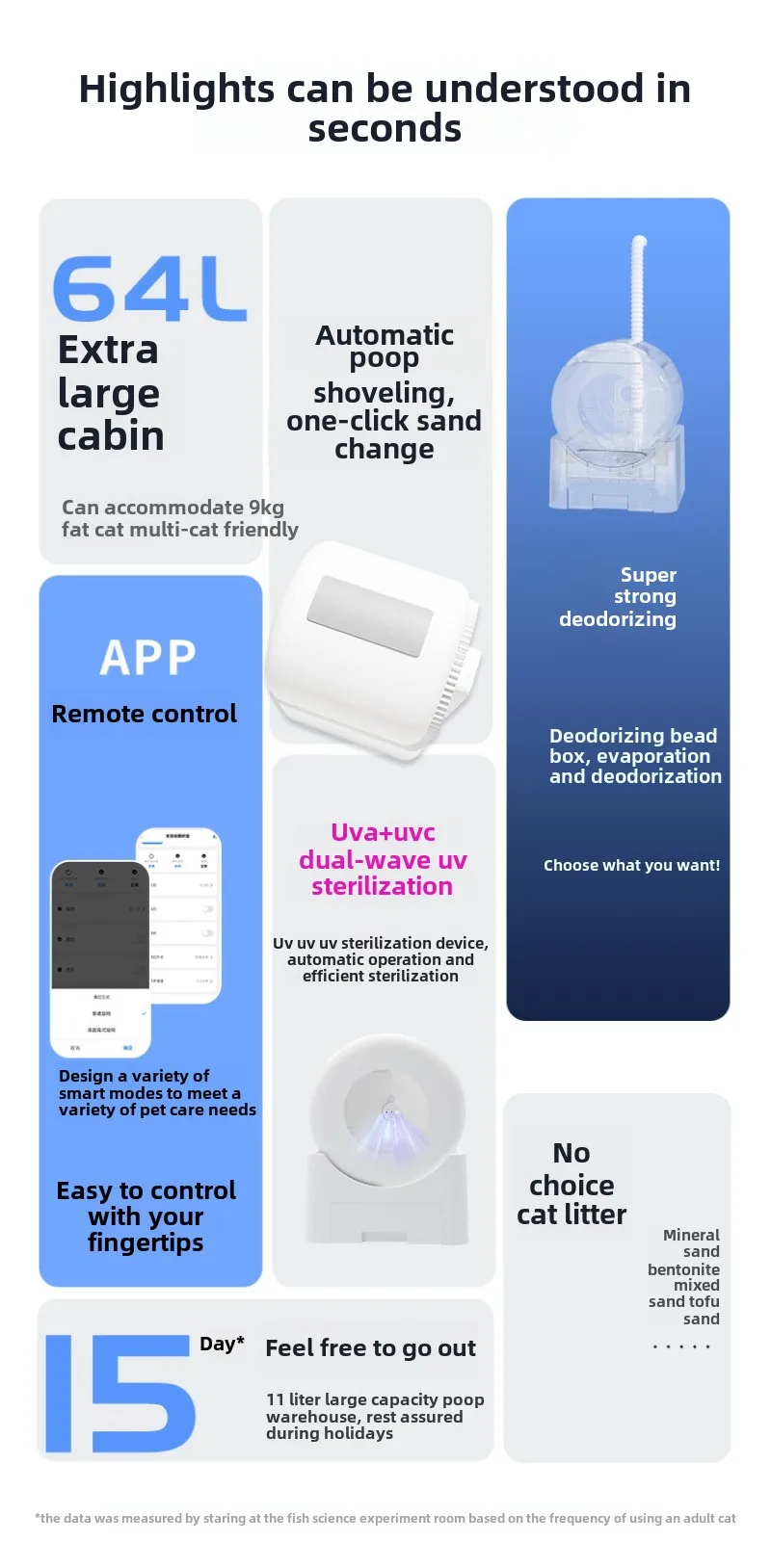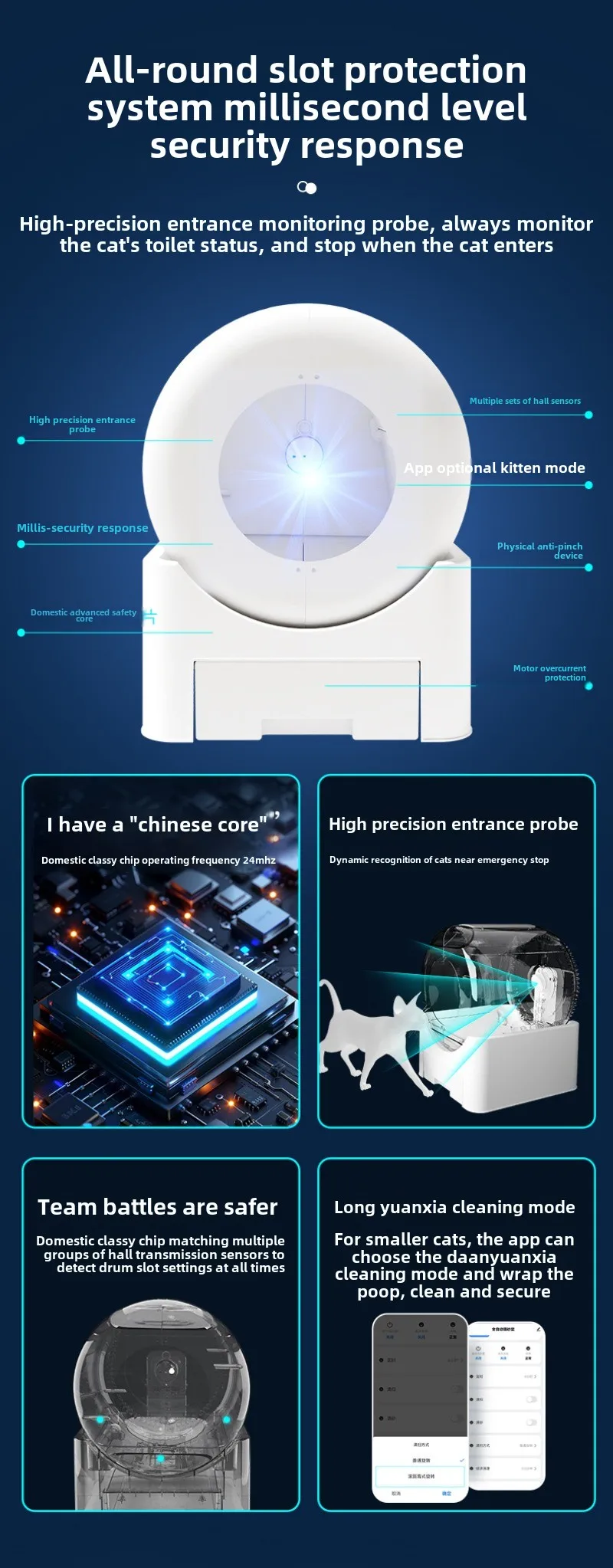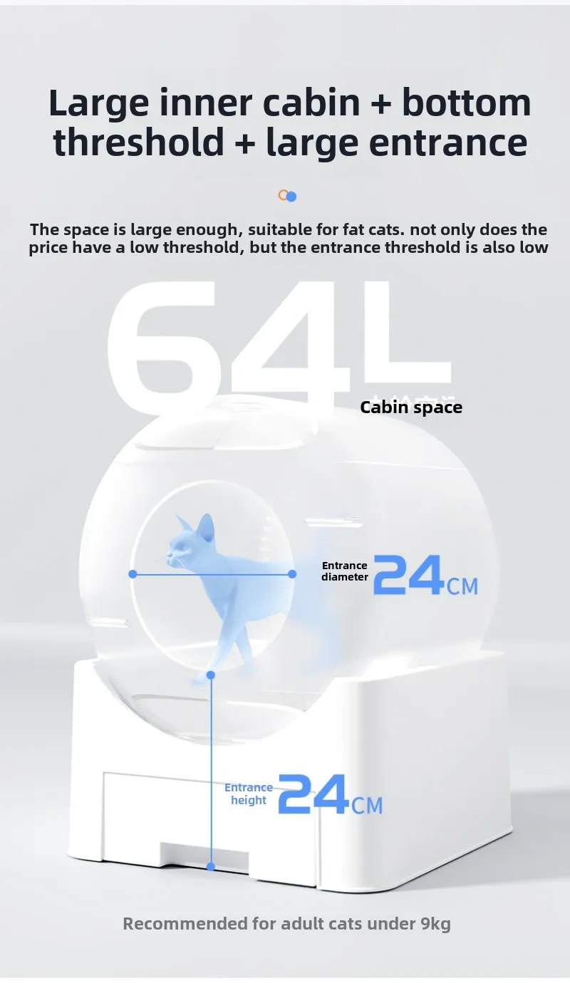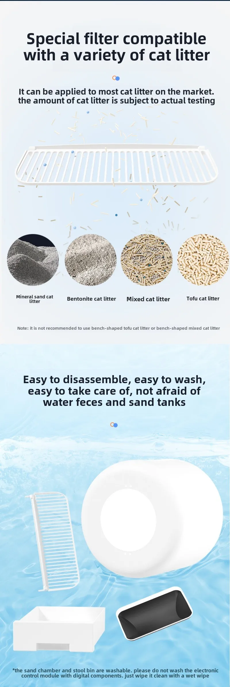 Description:Smart cat litter box, oversized, fully enclosed, splash-proof, fully automatic cleaning, deodorizing electric cat toilet Features: 1. APP remote control, a variety of modes are optional, automatic shit shoveling, one-click sand change 2. One-click replacement of old sand operation is simpler 3. A variety of operation modes can be selected for APP control, which is more convenient Mobile APP easy to operate, automatic mode, manual mode, timing mode, deep cleaning, round sky mode, many modes to choose from 4. Large inner cabin + bottom threshold + large entrance The space is large enough, suitable for fat cats, not only the price threshold is low, but also the entrance threshold is low 5.11 liter toilet Say goodbye to frequent shoveling, more suitable for multi-cat families 6. The use space is large, the area is surprisingly small, and it has been optimized many times. The base is integrally formed, and the width is only 42cm. It can also be placed in corners and corners. 7. Scientific deodorization design drives away odors and refreshes