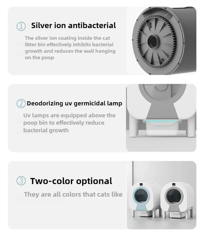 Características: (1) Detección infrarroja de entrada A través de la detección de infrarrojos, la caja de arena dejará de funcionar cuando la mascota se acerque a la máquina para evitar cualquier daño a la mascota. (2) Arena de apertura superior Limpio e higiénico, simple y conveniente. (3) estructura a presión Fácil de desmontar y lavar (4) desodorización activa de oxígeno al aire fresco Desafío 0 Olor (5) Bacteriostático de iones de plata El revestimiento de iones de plata dentro del compartimento de arena para gatos inhibe eficazmente el crecimiento bacteriano y reduce las caca que cuelgan en la pared. (6) Desodorización con lámpara de esterilización UV Hay una lámpara UV encima del almacén de conveniencia para la esterilización ultravioleta, lo que reduce eficazmente el crecimiento de bacterias.
