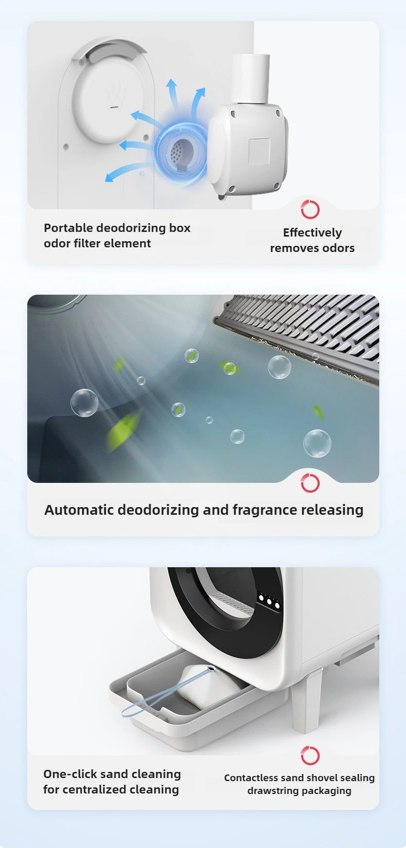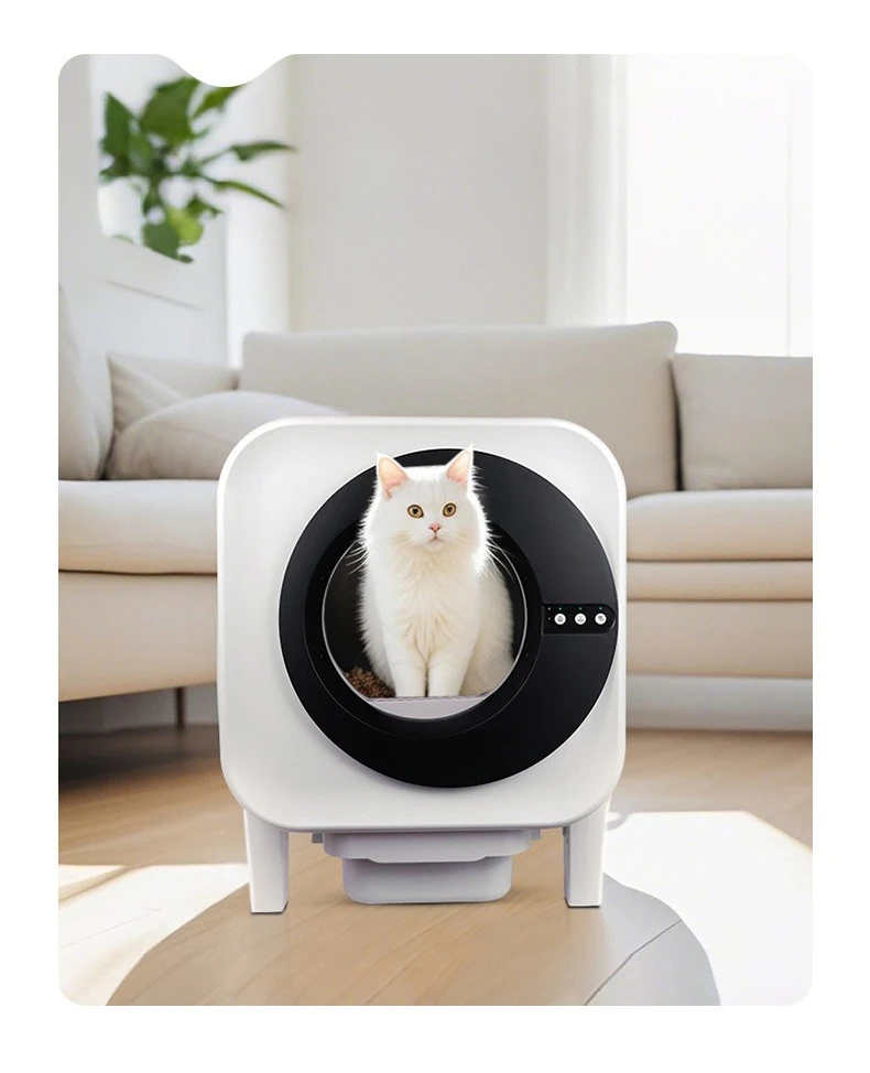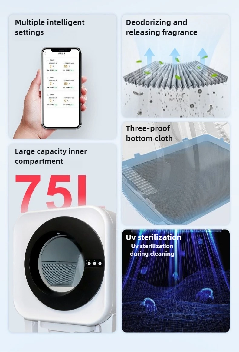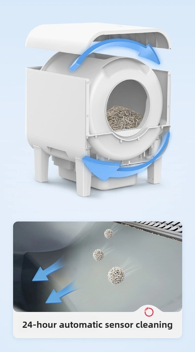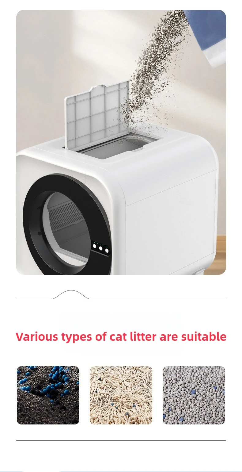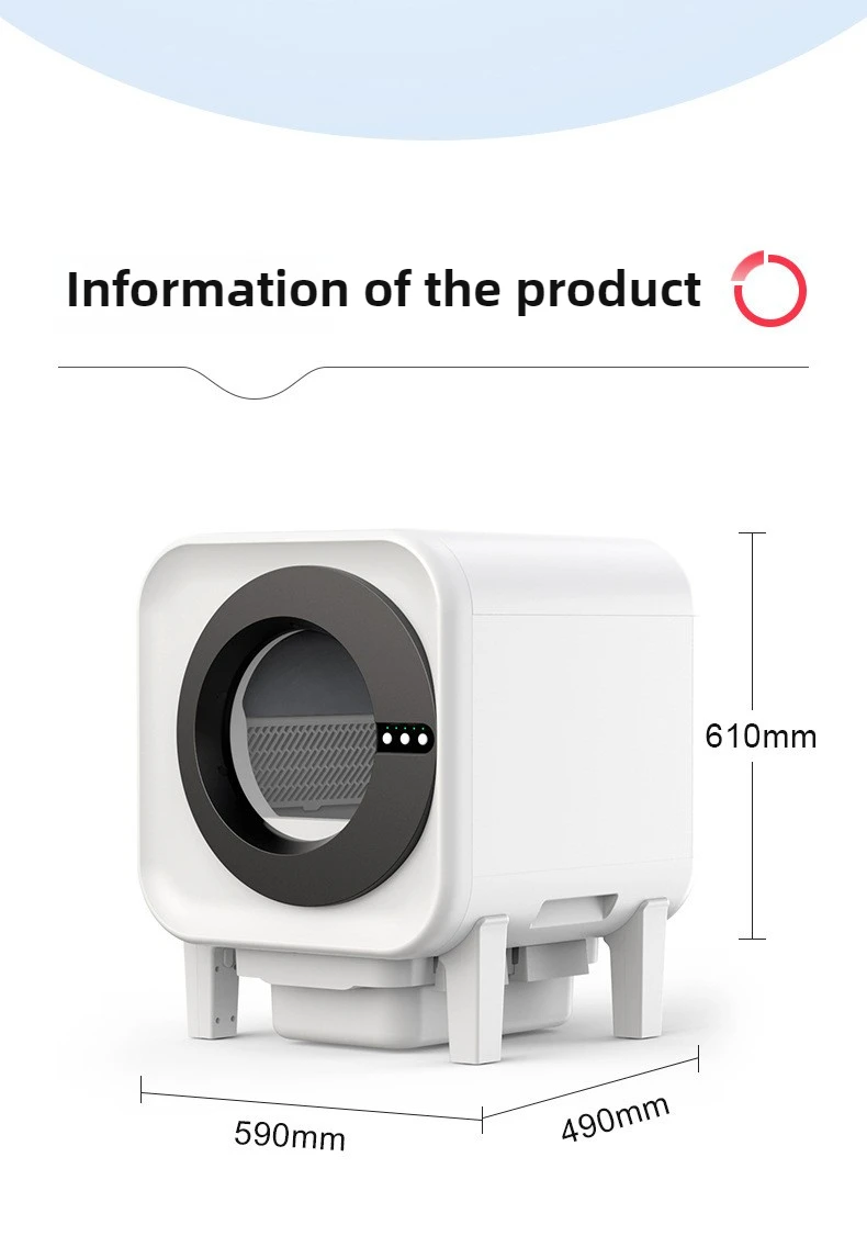 Información del producto Tamaño: 590x490x610 mm (largo x ancho x alto) Capacidad del contenedor: 14L Capacidad del cilindro interior: 75L Entrada nominal: 12V-2A Método de conexión: WiFi + Bluetooth 2,4G + 5G Ámbito de aplicación: Gatos mayores de 4 meses que pesan al menos 500 g