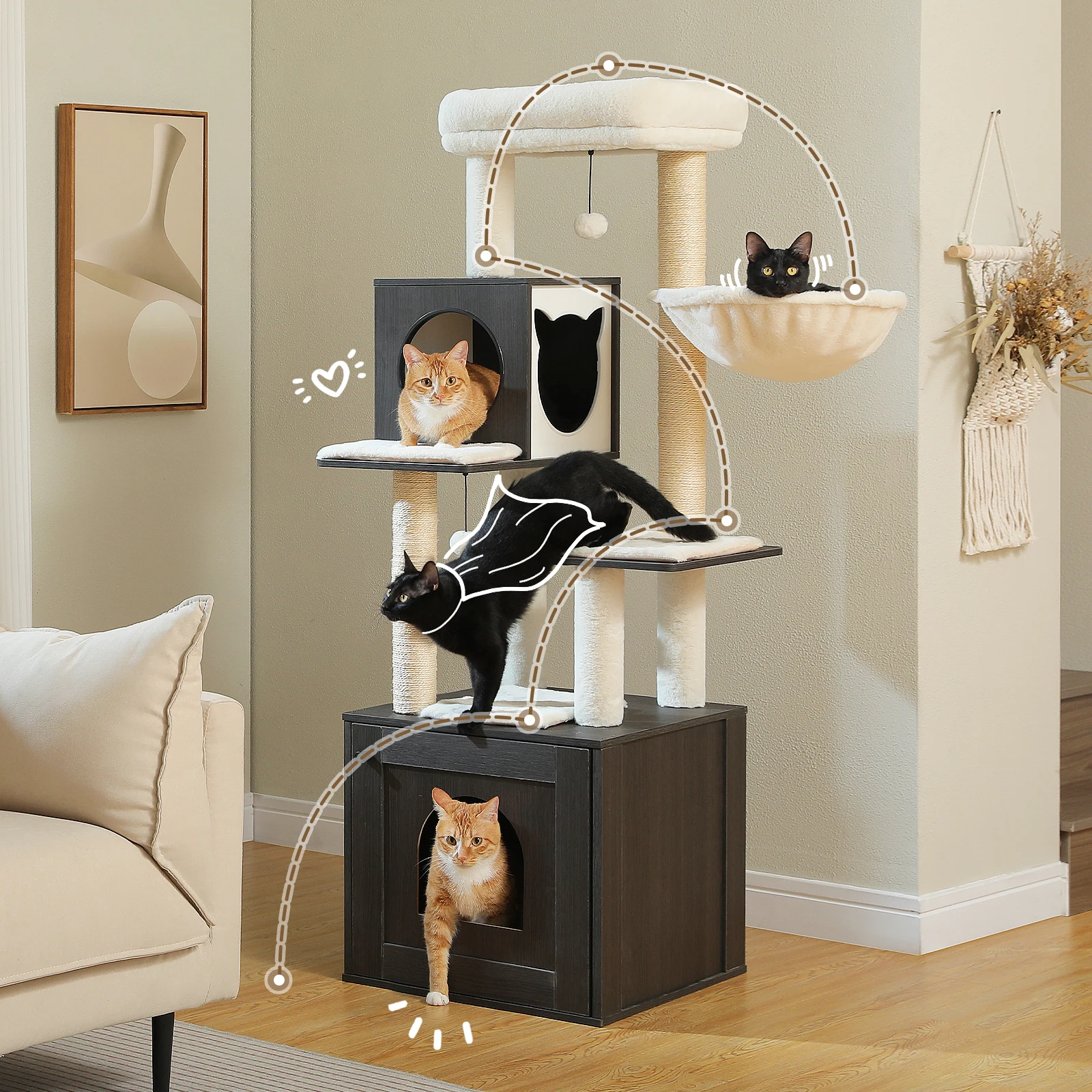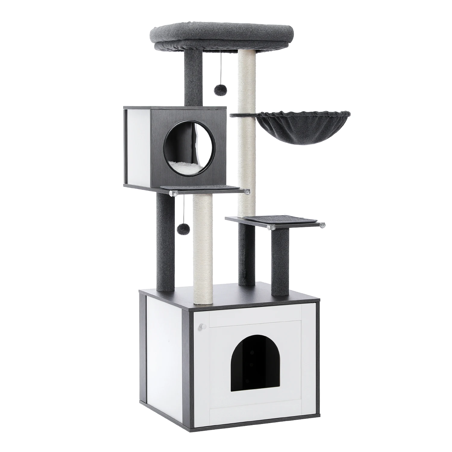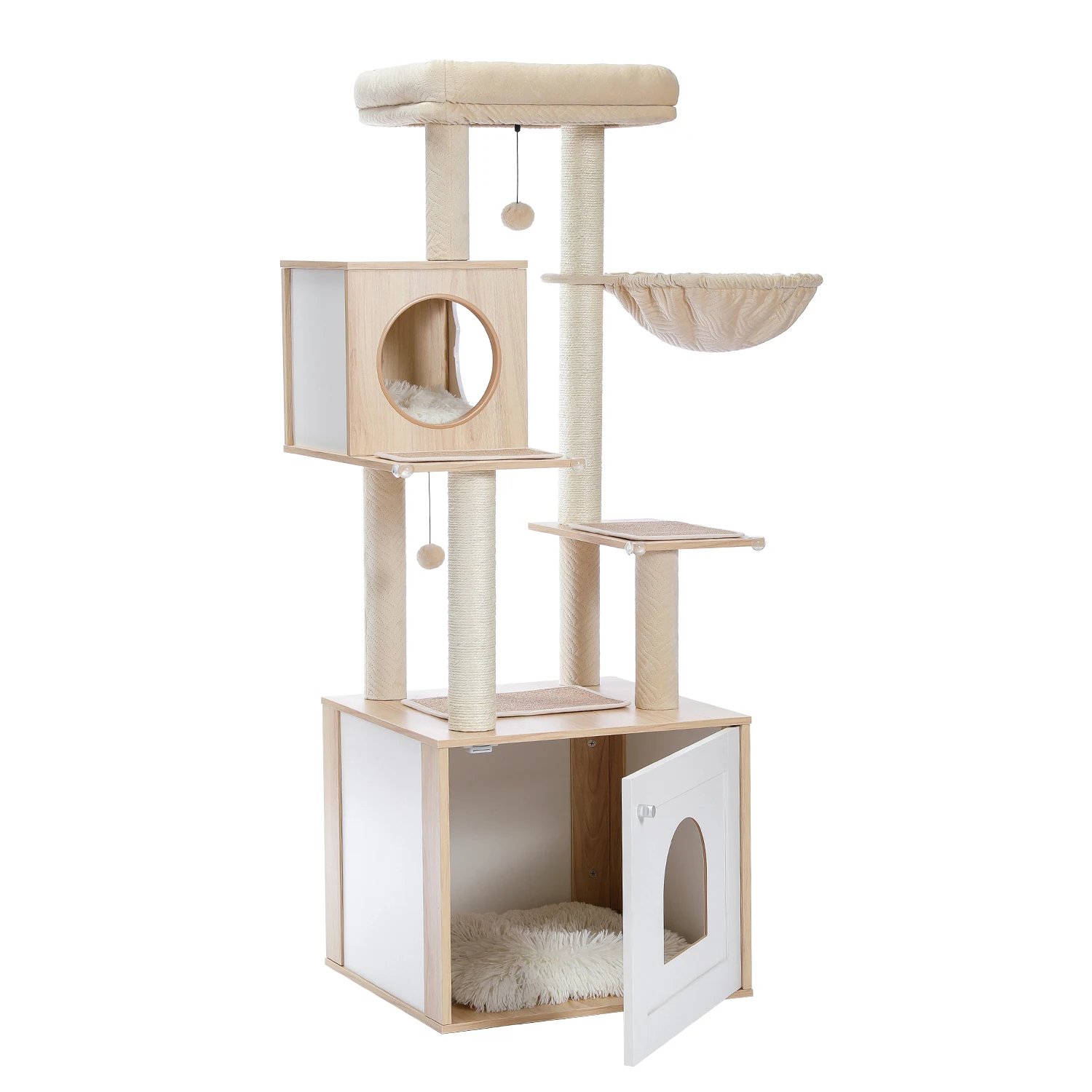 Caja de arena con torre de árbol para gatos, almacenamiento de estructura de madera con hamaca, condominio cómodo, tapete antideslizante, gabinete grande, plataforma grande, postes de sisal