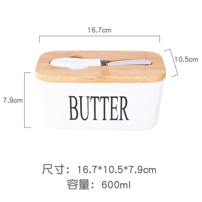 Caja de mantequilla de cerámica con cubierta de madera, con espátula, cuchillo, caja de mantequilla fresca sellada, caja de almacenamiento de cocina sellada Rectangular Multicolor