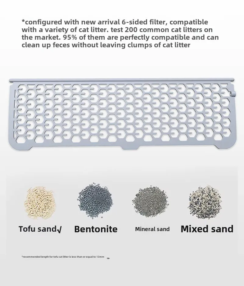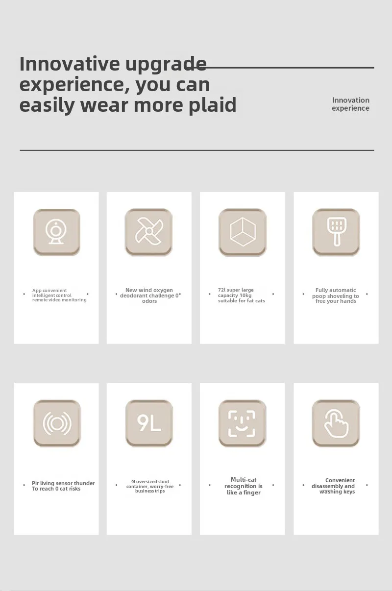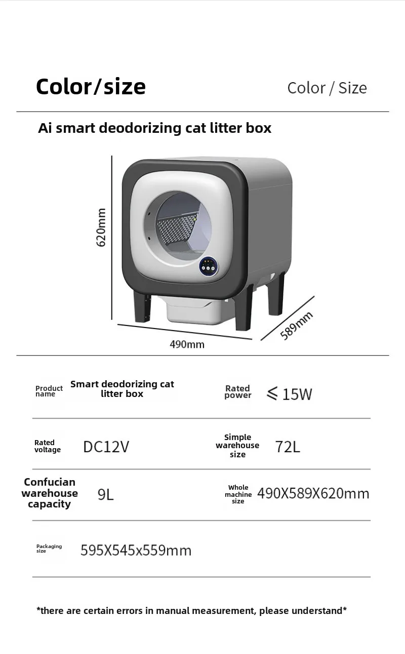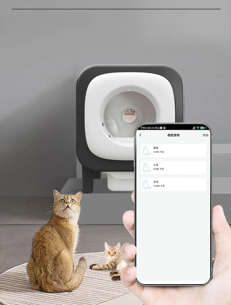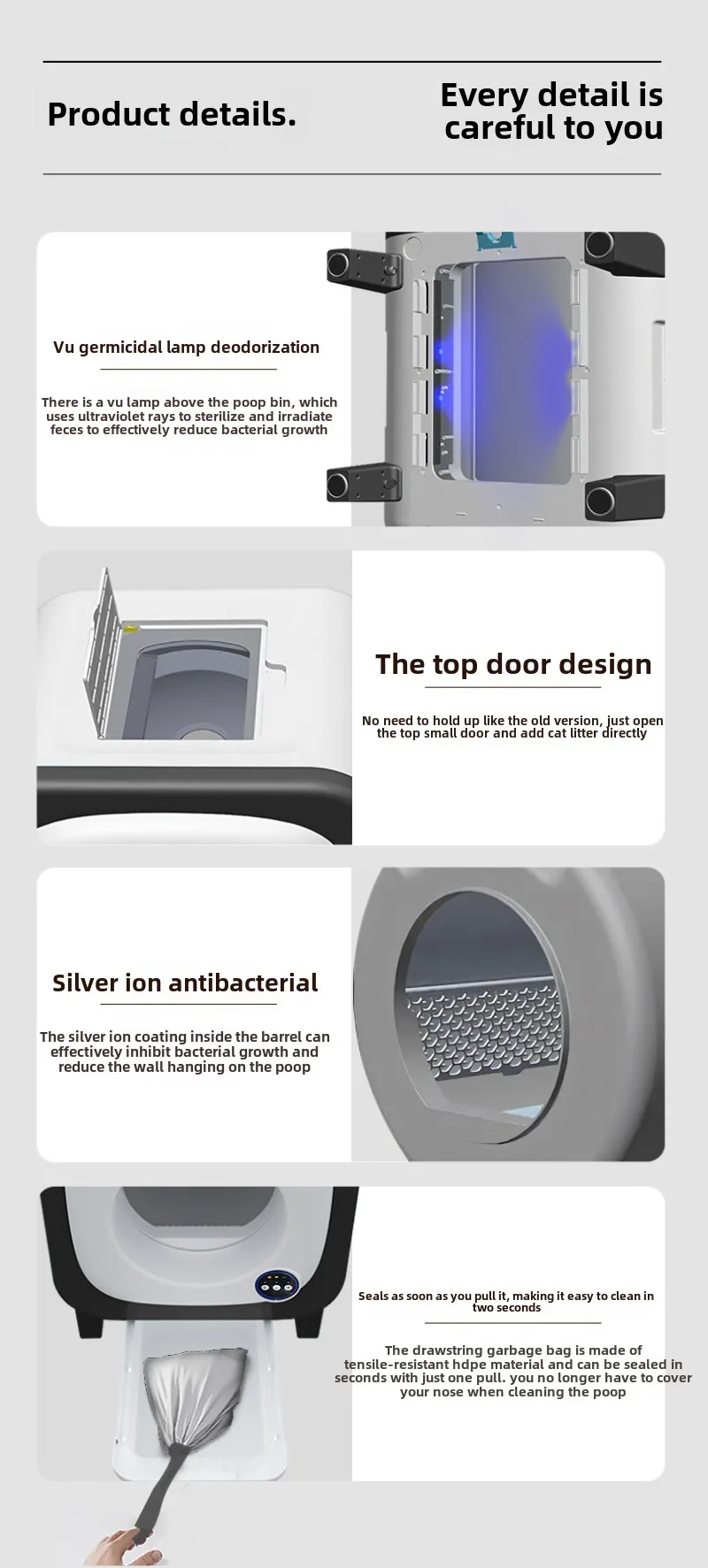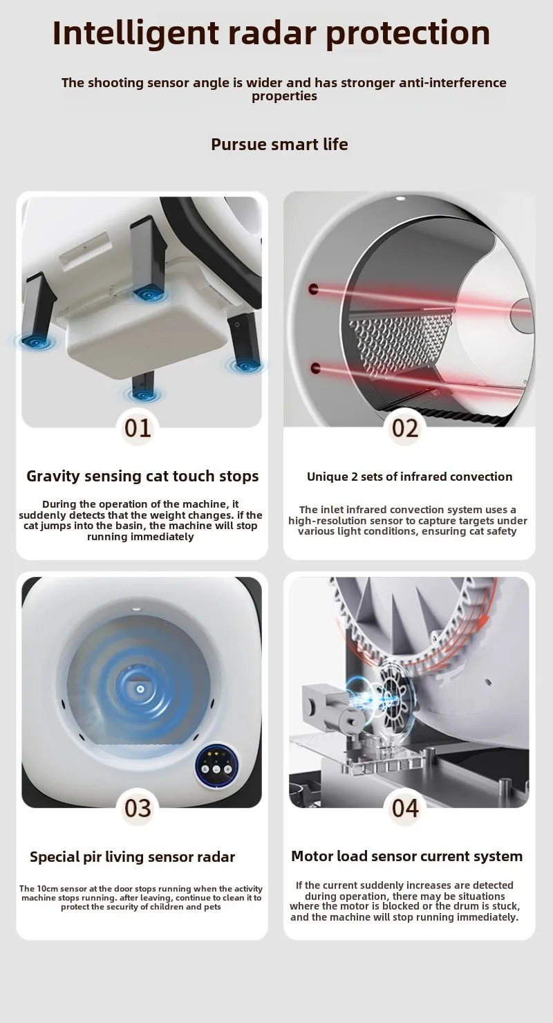 Descripción:Caja de arena para gatos de limpieza automática inteligente y limpiable Caja de arena para gatos automática con control de teléfono móvilCaracterísticas: El sistema de aire fresco tiene una potente desodorización y le permite respirar libremente. Se puede instalar un extractor de aire fresco detrás del fuselaje para extraer el olor en la caja de arena para gatos desde el exterior y garantizar aire interior fresco. Puede identificar de forma inteligente a los gatos dentro de 3 años y controlar los datos de los gatos en cualquier momento. El nuevo sistema de escaneo de radar PIR tiene una sensibilidad excepcional y puede detectar tridimensionalmente el enfoque del gato.No lo altera el entorno externo y tiene más ventajas en el ángulo de detección que la detección de infrarrojos y la detección de radiación cruzada, y tiene una fuerte antiinterferencia. Protección de radar inteligente, ángulo de inducción de radiación más amplio y antiinterferencias más fuerte, Paradas táctiles para gatos con detección de gravedad Durante el funcionamiento de la máquina se detecta un cambio brusco de peso.Si el gato salta al lavabo, la máquina dejará de funcionar inmediatamente. 2 grupos únicos de radiación infrarroja El sistema de radiación infrarroja de entrada utiliza sensores de alta resolución para capturar objetivos en diversas condiciones de luz para garantizar la seguridad de los gatos. Radar de detección en vivo PIR ad hoc 10 CM en la puerta detecta que la máquina viva deja de funcionar y continúa limpiando después de salir para proteger la seguridad de niños y mascotas. Sistema de corriente inducida por carga del motor Si se detecta un aumento repentino de la corriente durante el funcionamiento, puede haber una situación en la que el motor está atascado o el rodillo está atascado y la máquina dejará de funcionar inmediatamente.
