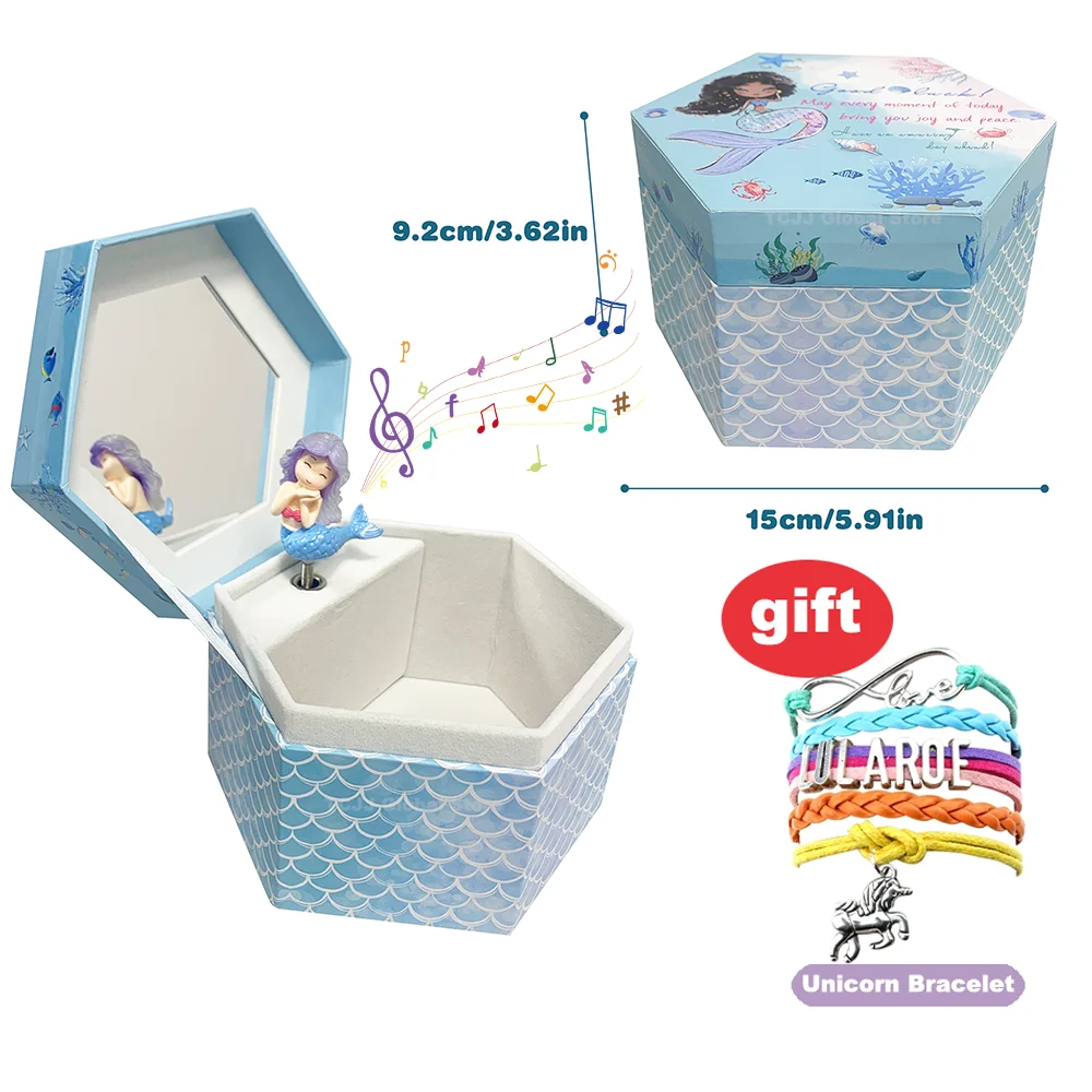 Esta caja de música con temática de sirena/unicornio es un regalo de ensueño diseñado específicamente para niñas pequeñas. No es solo una caja de música, sino también una pequeña caja de almacenamiento de joyas que se puede usar para guardar accesorios queridos como aretes, collares, etc. Cada vez que se abre la tapa, acompañada de una agradable melodía, la muñeca sirena o unicornio comienza a girar, como si estuviera sumergida en un mundo de cuento de hadas. Ya sea como artículo diario para niñas o como regalo navideño, puede brindarles una felicidad infinita y hermosos recuerdos.