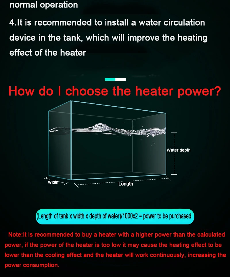 (Largo del tanque x ancho x profundidad del agua)/1000x2=potencia a comprar