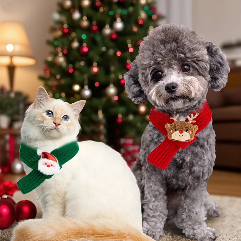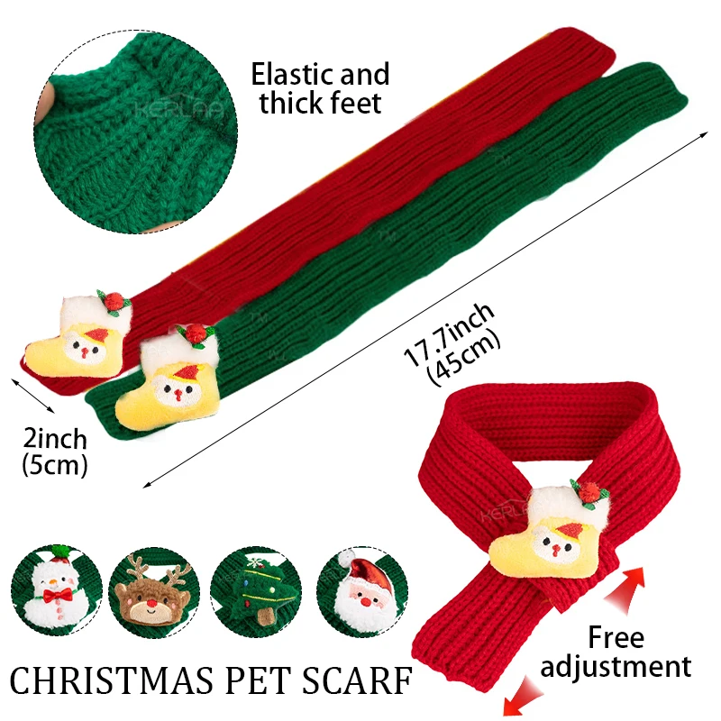 Bufanda navideña para mascotas de punto: confeccionada en tejido de punto suave y grueso en clásicos colores festivos rojo y verde, con accesorios festivos de campana.El diseño elástico garantiza un ajuste cómodo para perros y gatos pequeños y medianos, proporcionando calidez sin asfixia.¡La fiesta de Navidad perfecta, tome fotografías o haga un paseo diario de invierno para agregar la alegría de la temporada navideña en el guardarropa de su mascota!