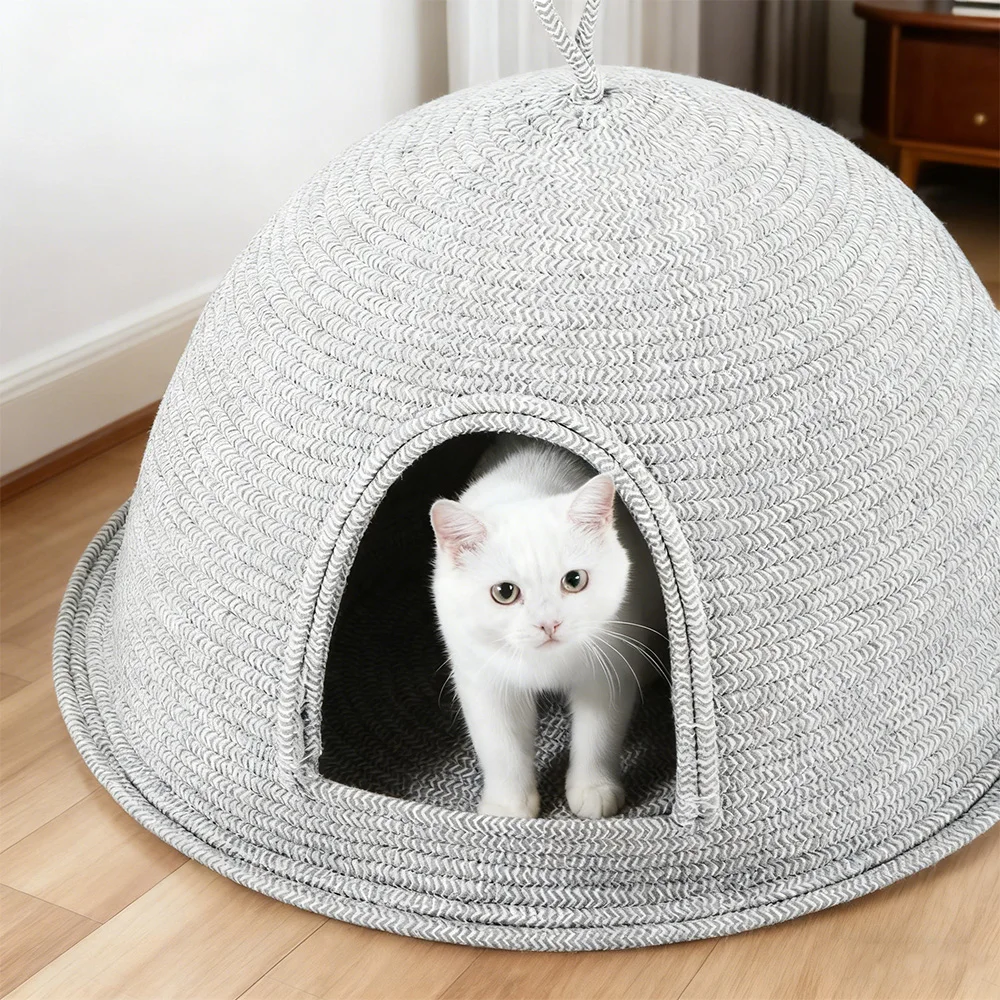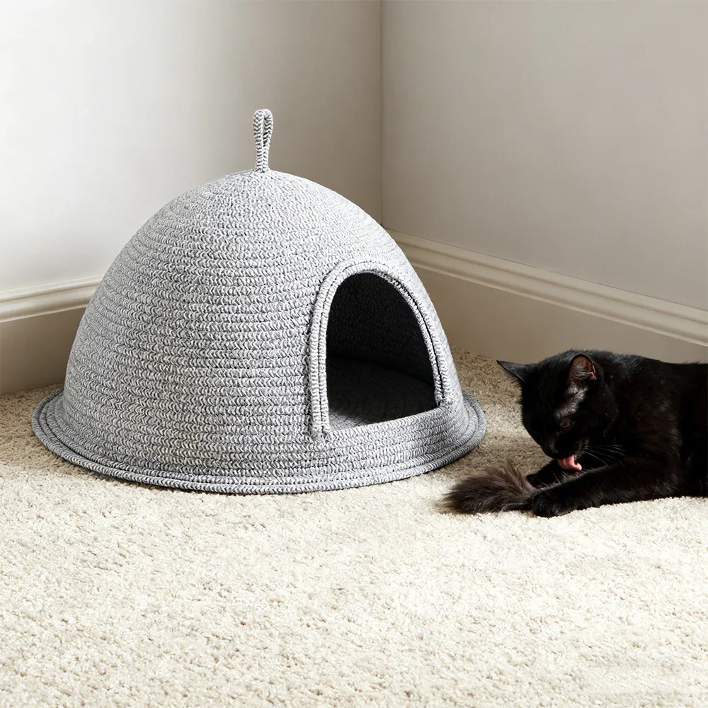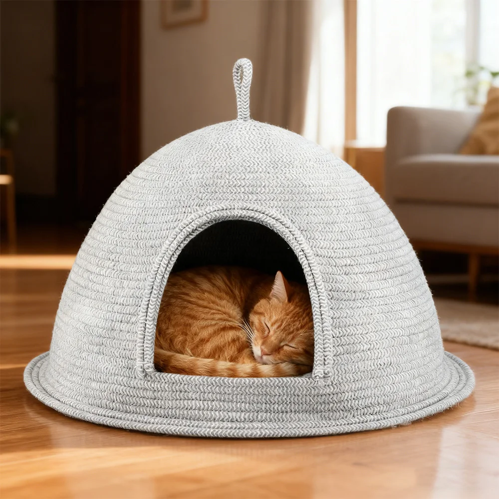 Inspirado en el diseño semicerrado de los tuyos tradicionales, se adapta con precisión a la inclinación natural del gato para "esconder y donear".La cúpula curva, combinada con la altura de entrada adecuada, no solo preserva la vista del gato del mundo exterior, sino que también crea un espacio privado exclusivo, aliviando eficazmente el estrés y la ansiedad cuando está solo.Las líneas generales son simples y suaves, combinadas con una delicada textura de la tela.Ya sea que se coloque junto al sofá de la sala de estar, en la esquina del dormitorio o en la zona de entrada, puede combinarse naturalmente con el estilo del hogar moderno, convirtiéndose en un mueble práctico y decorativo para mascotas.