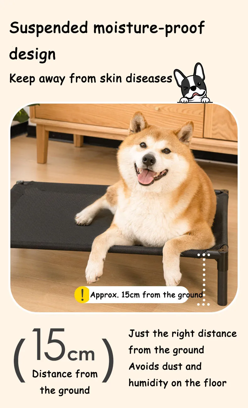 La distancia desde el suelo es de aproximadamente 15cm más o menos, lo cual es adecuado para ayudar a las mascotas a mantenerse alejadas de las enfermedades de la piel y evitar el polvo y la humedad del suelo.