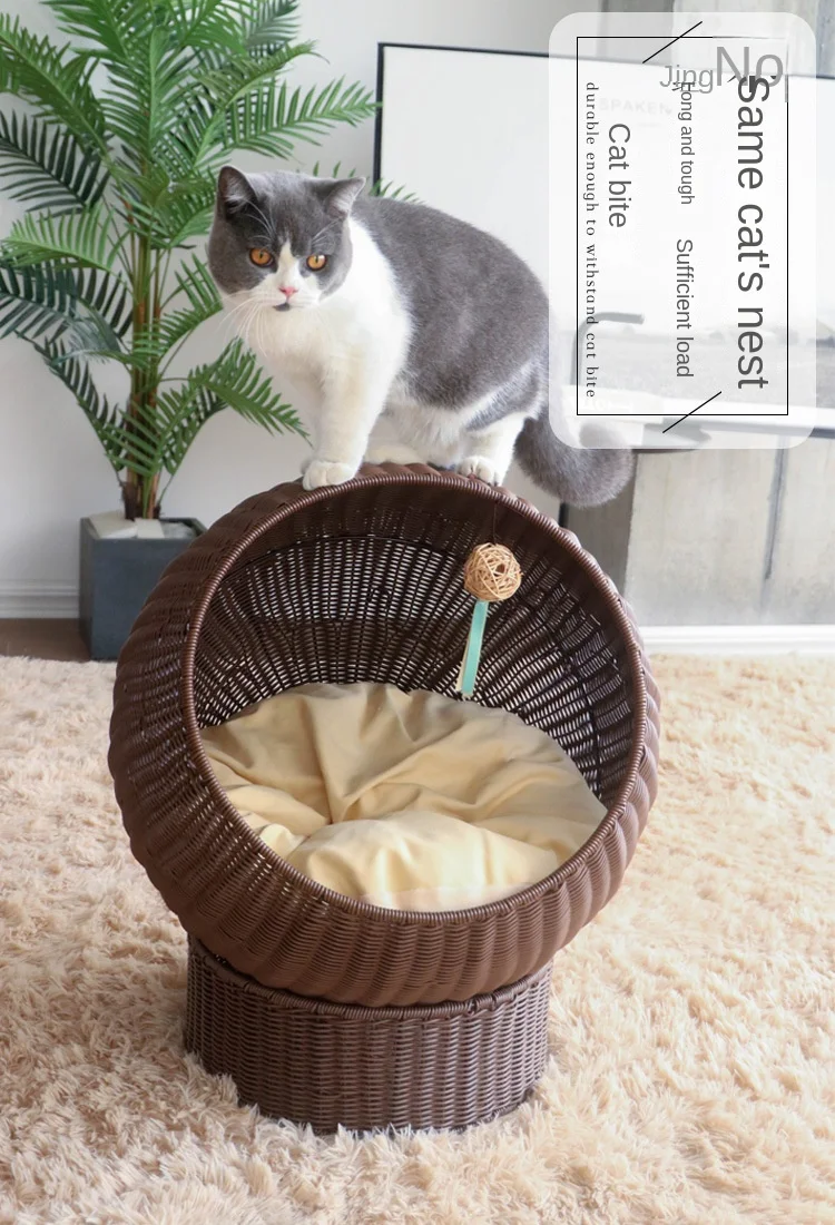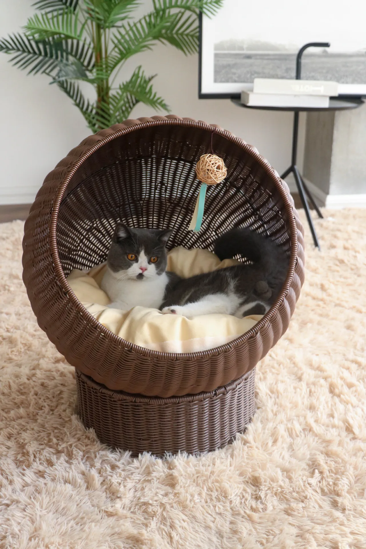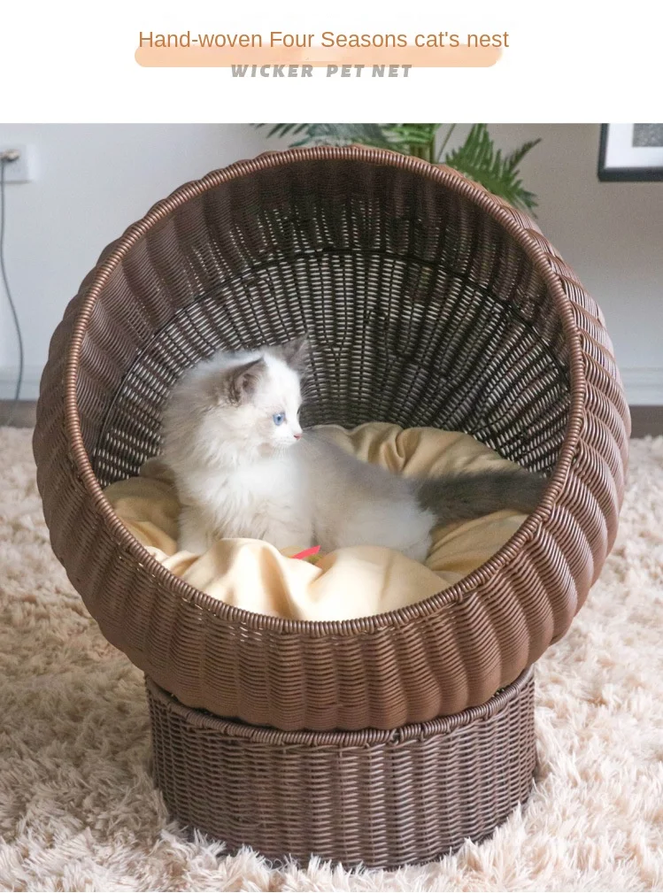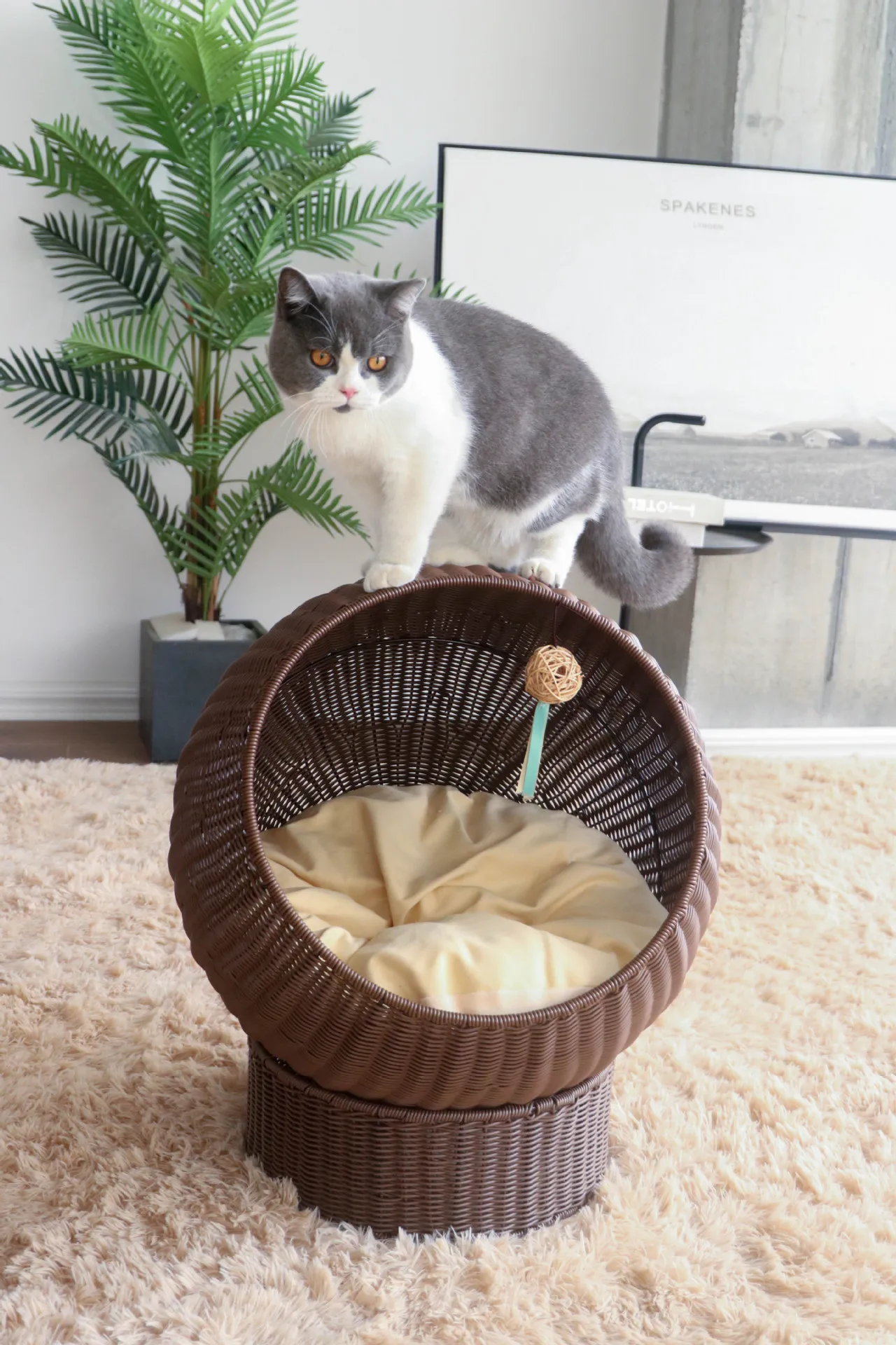 Cama de gato elevada tejida a mano con cojín, cesta de mimbre de imitación, casa de gatito con soporte, Cama de Gato elevada para gato de interior