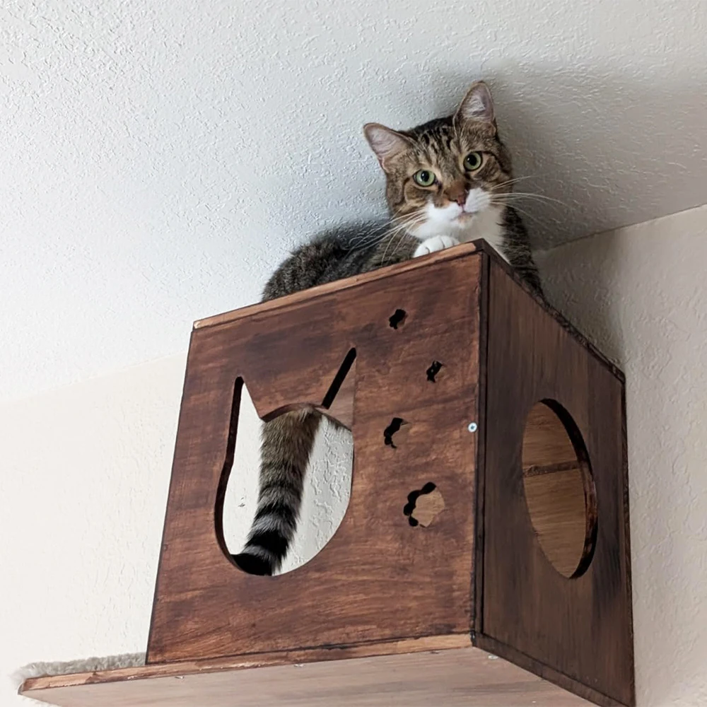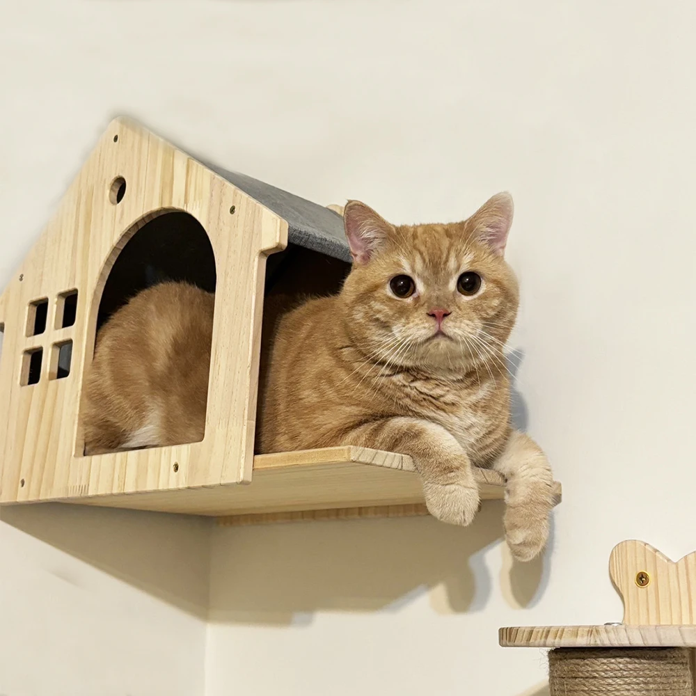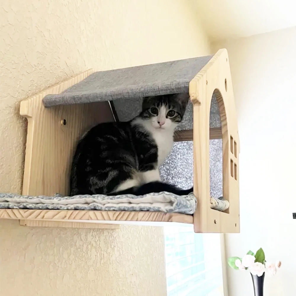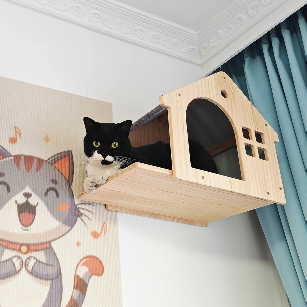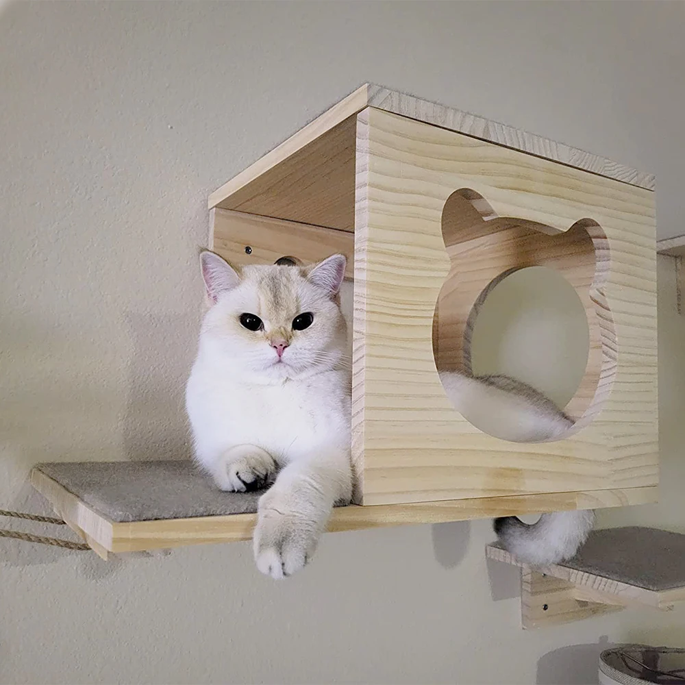 Cama para gatos de madera maciza montada en la pared, casa para mascotas de madera maciza con torre de fieltro para gatos, adecuada para gatitos y gatos grandes