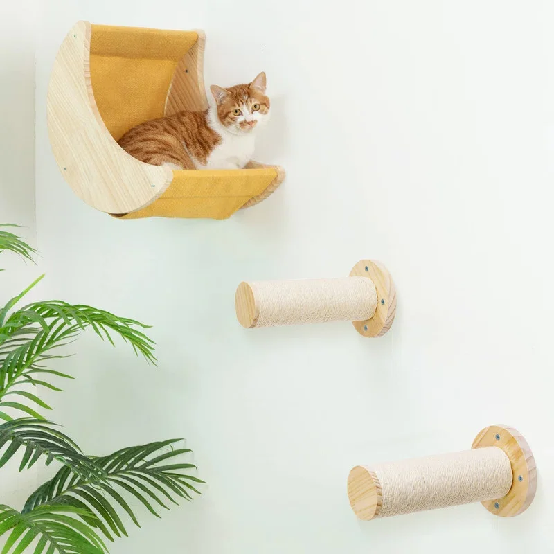 Nuestros muebles para gatos de pared están diseñados para satisfacer los instintos de su gato.Hay varias instalaciones disponibles, como escaleras trepadoras, postes rascadores, hamacas de descanso y nidos cómodos, lo que permite a los gatos trepar, rascarse y descansar, brindando infinitas oportunidades de exploración y juego.Esto ayuda a liberar su energía, reduciendo significativamente la probabilidad de que dañen sus muebles.