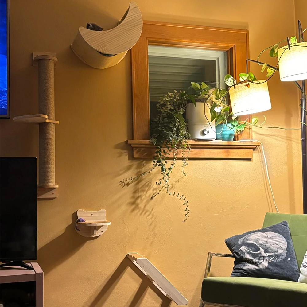 Los muebles de pared para gatos están hechos de madera natural de alta calidad y otros materiales seguros, resistentes, duraderos e inodoros. La superficie lisa sin rebabas garantiza la seguridad de sus gatos mientras juegan, al mismo tiempo que prioriza su salud, brindándole satisfacción y tranquilidad como dueño de un gato.