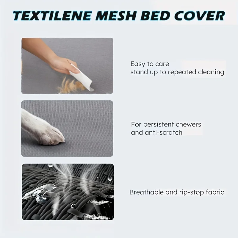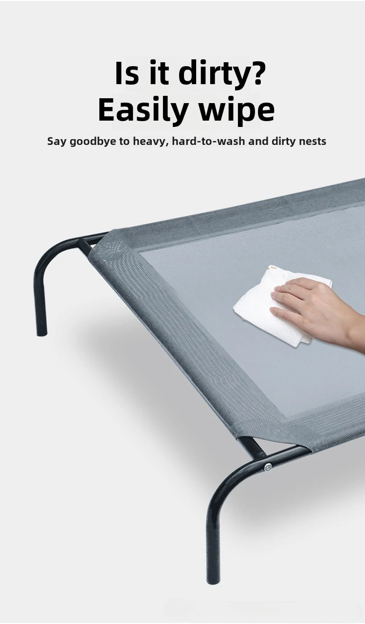 Esta cama elevada para perros es muy fácil de limpiar.Puedes limpiar fácilmente el pelo de las mascotas, el vómito y el polvo.Simplemente limpie la malla con agua del grifo, una manguera o un paño húmedo.Para limpiar a fondo toda la malla, se puede utilizar jabón suave o productos de limpieza naturales.Esto es rápido y conveniente, por lo que ya no tendrá que preocuparse por el olor, la suciedad o el exceso de pelo de su mascota.