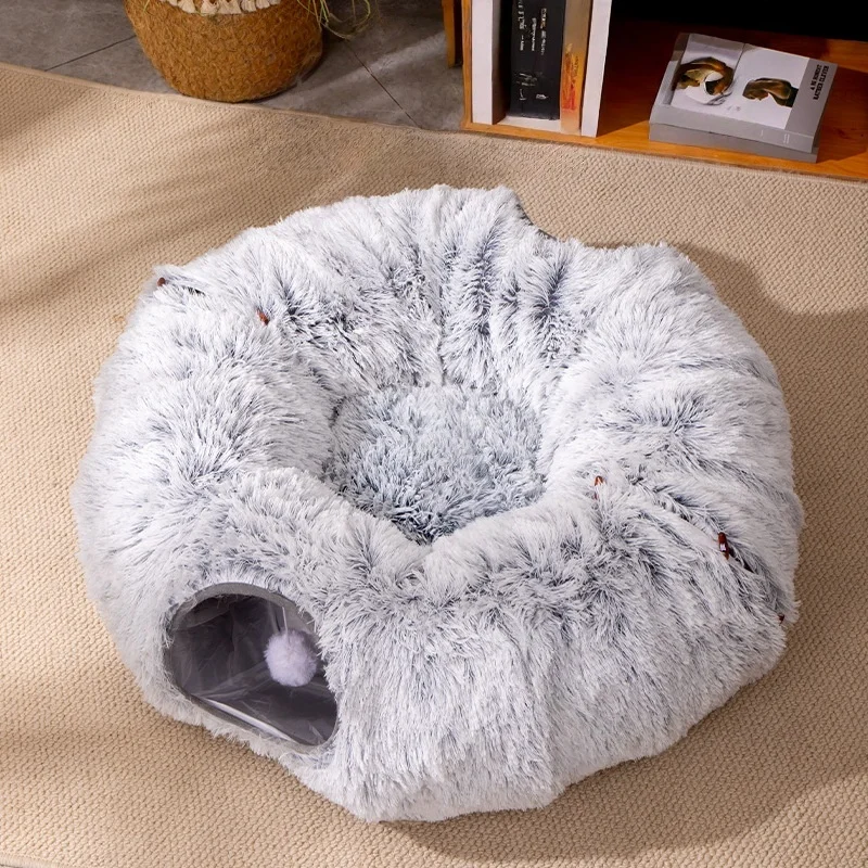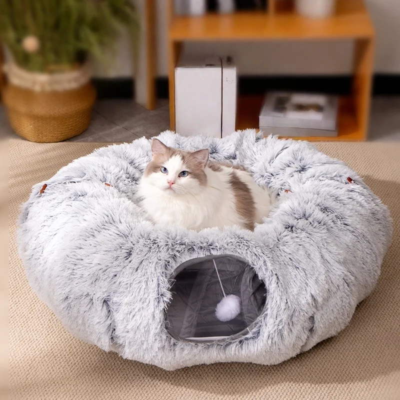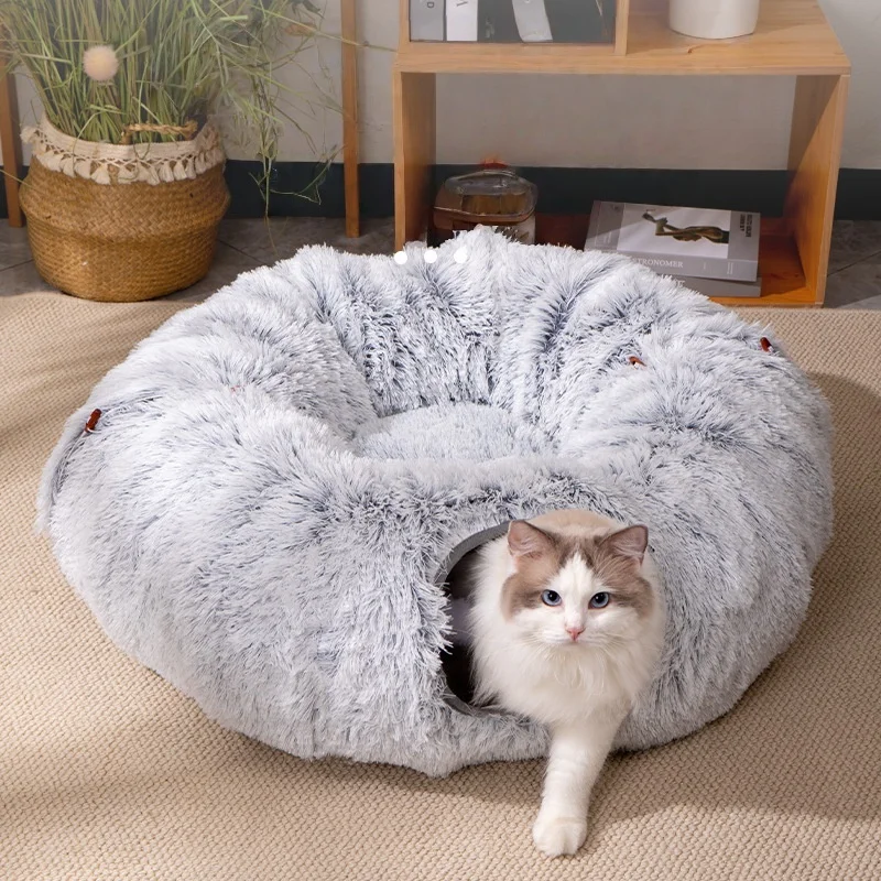 Cama tipo túnel plegable de felpa para gatos: cueva para gatos de invierno aislada con agujeros de Peek, cápsula acogedora convertible para gatos de interior