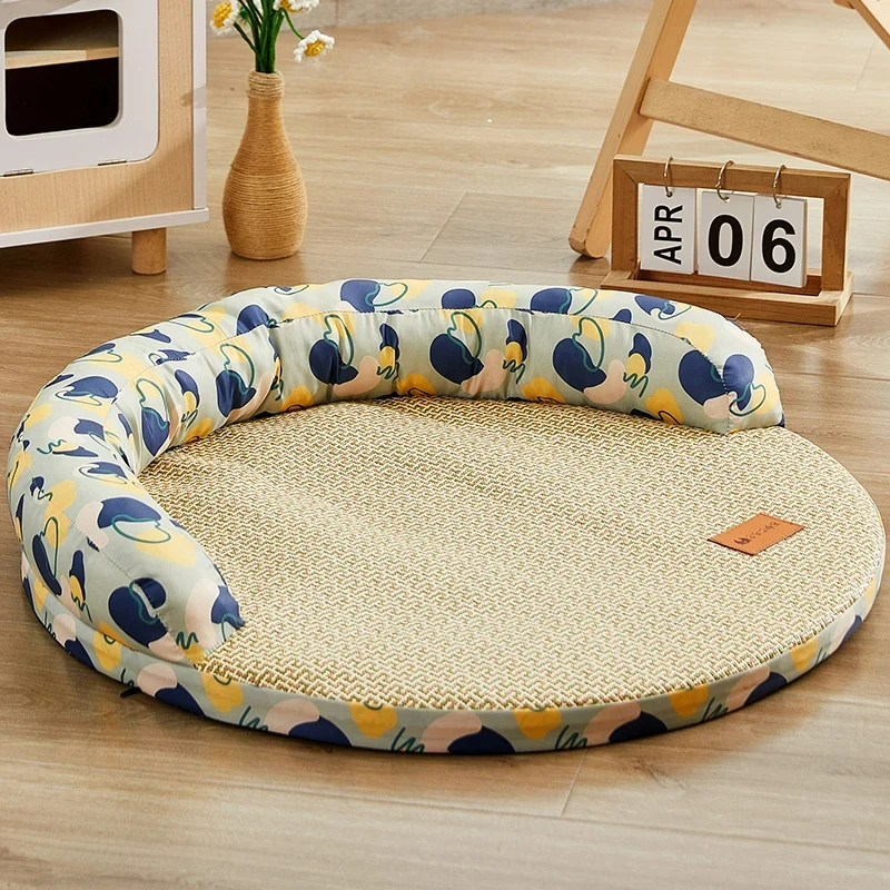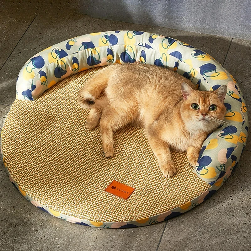 1. Hecho de algodón PP + esponja + tapete de ratán + material de seda helada, se siente cómodo y fresco, su mascota se enamorará de la almohadilla refrescante para mascotas cuando quiera estar fresca.