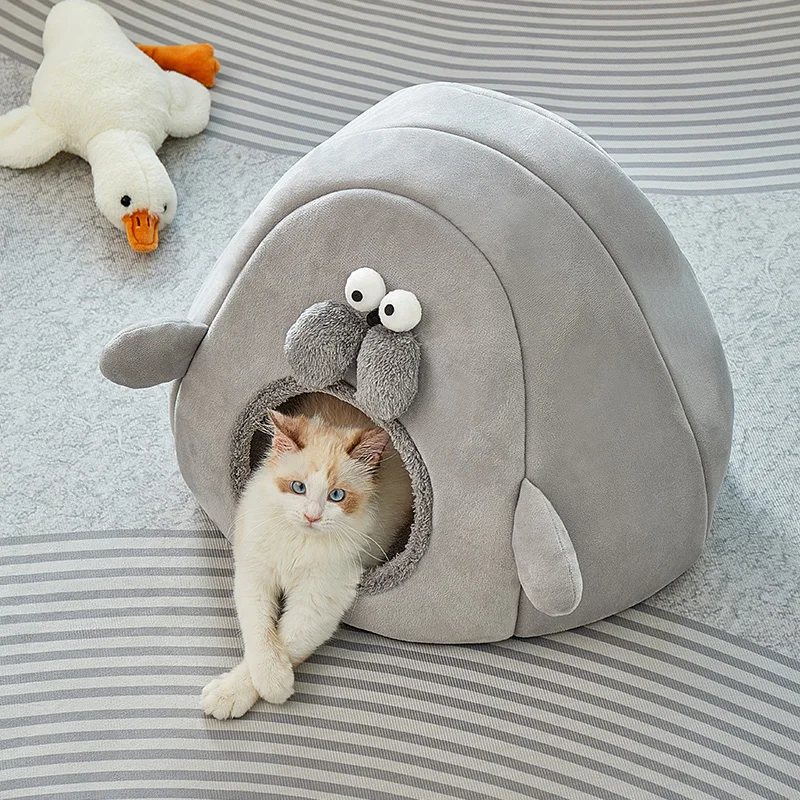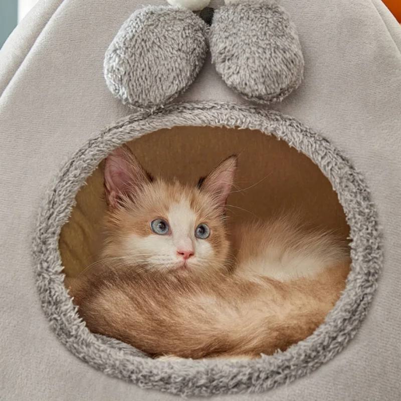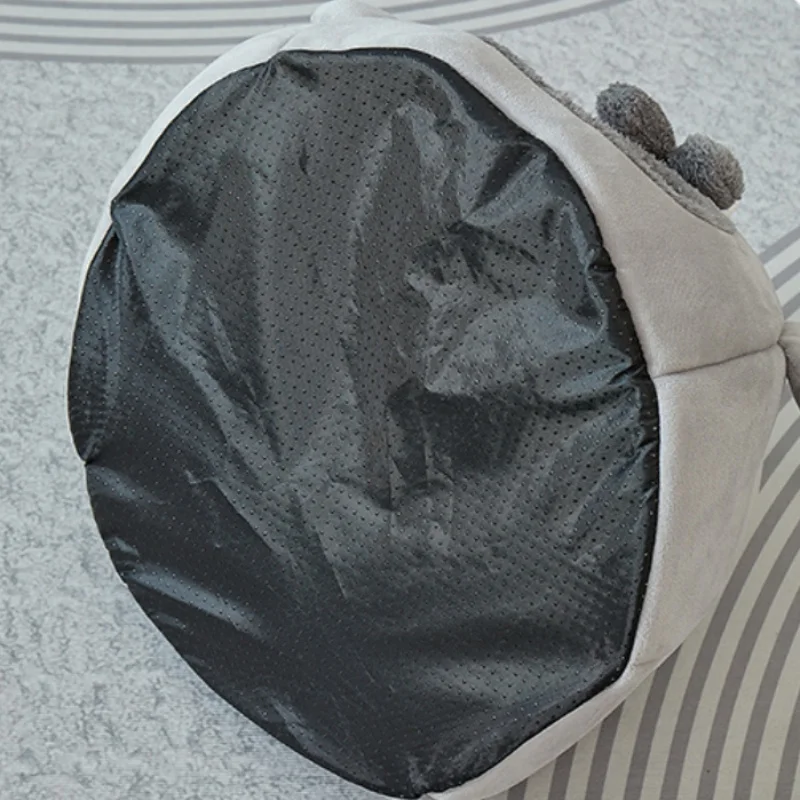 Esta cama para gatos tiene una apariencia totalmente adorable. Con la forma de una linda criatura, está principalmente en un suave tono gris. En la parte superior, hay dos ojos grandes y redondos que se ven animados, y debajo de ellos, dos estructuras grises peludas se asemejan a una linda nariz o mejillas. La entrada es una acogedora abertura circular forrada con material de felpa. A cada lado, hay pequeñas protuberancias redondeadas que aumentan su aspecto caprichoso. No es solo un lugar cómodo para los gatos, sino también una encantadora pieza decorativa que puede encajar fácilmente en varios estilos de hogar, aportando un toque de ternura a su espacio vital.