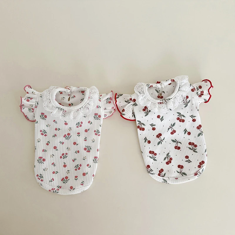 Camisa básica de manga voladora de encaje Floral de cereza para mascotas, chaleco bonito para Gato, ropa para cachorros, ropa para perros pequeños